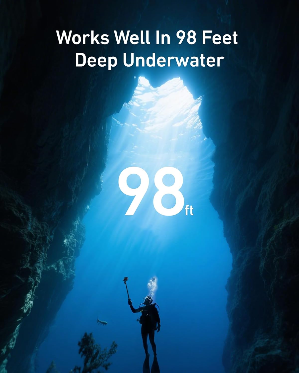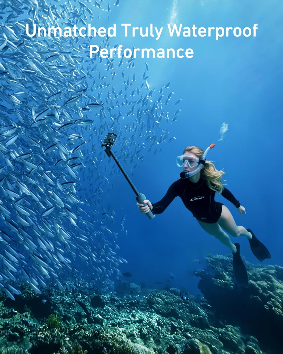- Poste de longitud extra de 33 pulgadas para tomas épicas de gran angular: Perfecto para capturar escenas submarinas expansivas, desde arrecifes de coral vibrantes hasta majestuosa vida marina, haciendo que tus imágenes sean realmente cinematográficas.