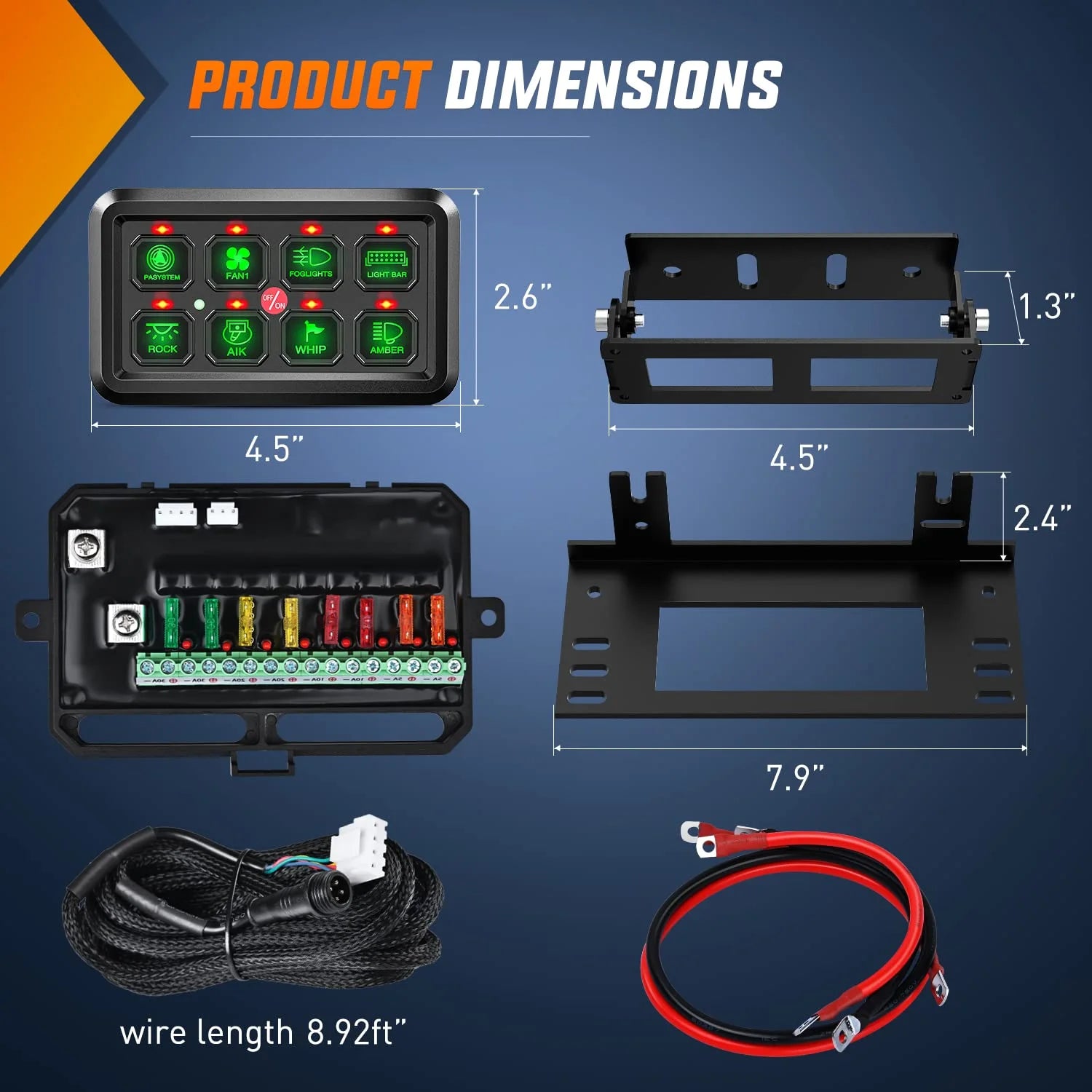 Sistema de panel de interruptores de 8 vías: Voltaje de funcionamiento: 12-24 V CC, potencia máxima de salida: 1200 vatios. Permite controlar hasta 8 accesorios simultáneamente. La solución perfecta para organizar el cableado y controlarlo todo mediante un panel de interruptores.