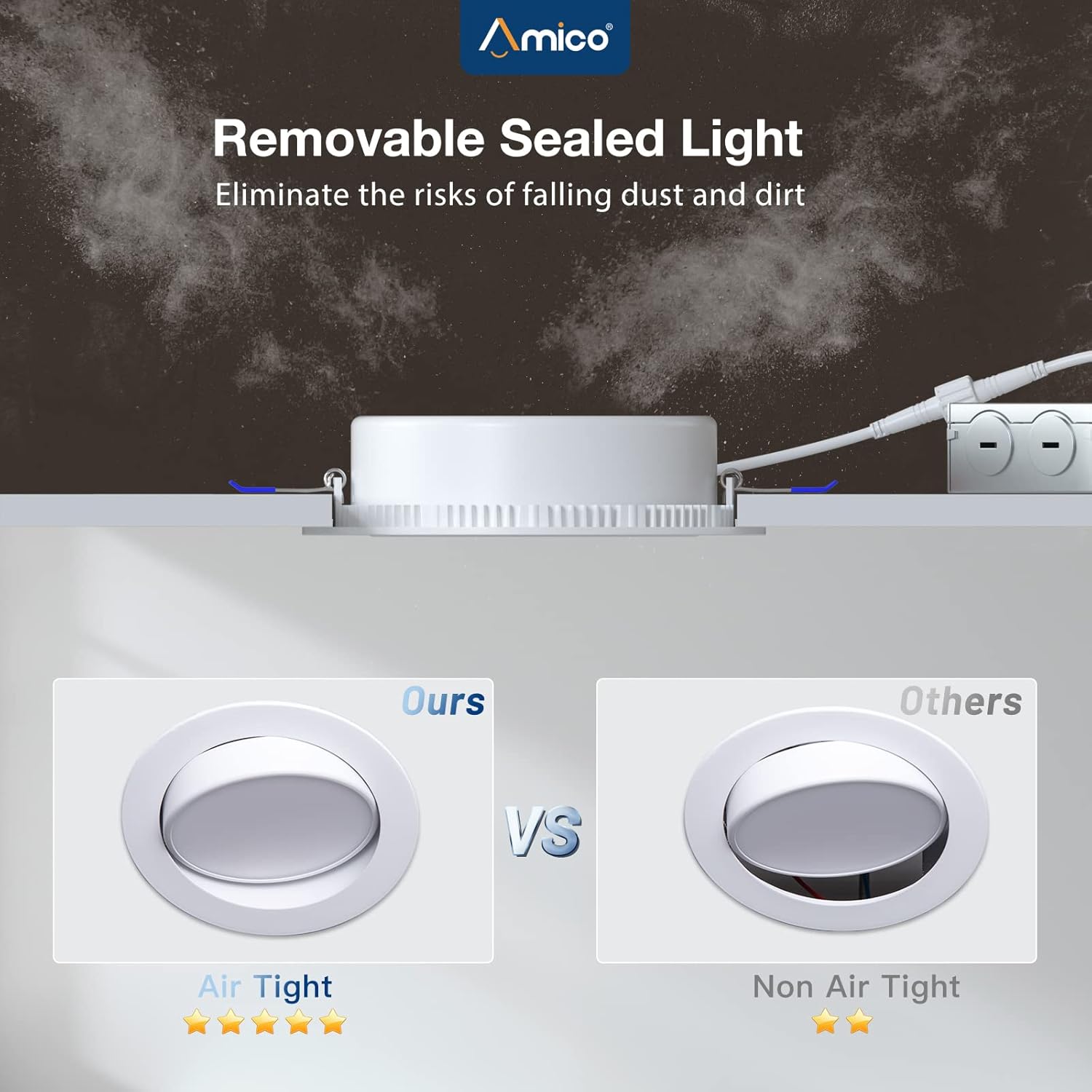 - Clasificación IC: la luz empotrada LED sin lata de Amico tiene clasificación IC, lo que permite estar en contacto con aislamientos en techos, lo que significa que la caja de conexiones está térmicamente protegida. Solo requiere tan pequeño como 2 pulgadas de espacio en el techo y se adapta a varios techos y vigas. No causará un incendio en el techo ni en el espacio de la vigueta superior.