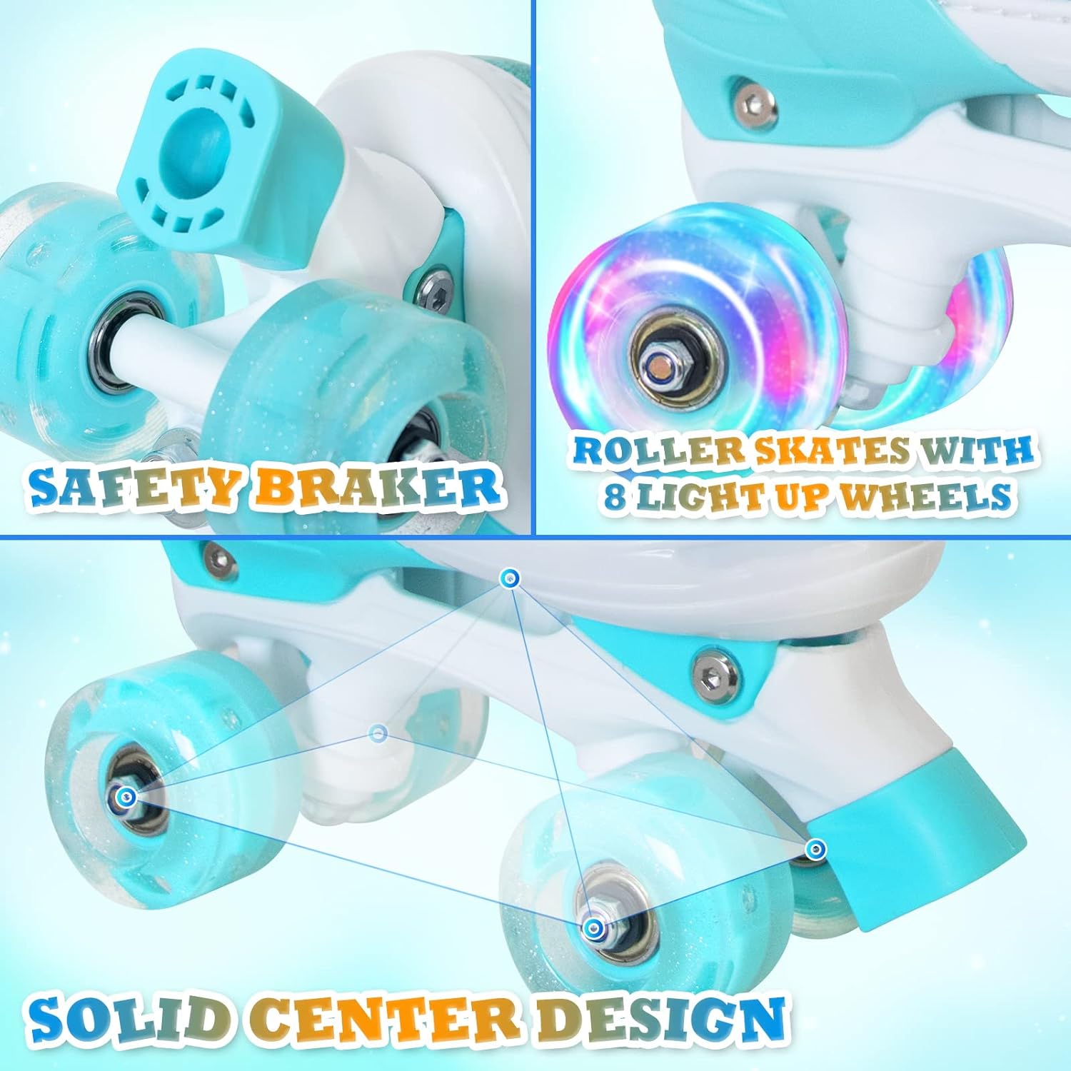 - Ruedas geniales: 8 ruedas iluminadas, luces coloridas en el interior con potencia autogeneradora y no requiere pilas. La luz intermitente más genial ofrece más diversión para los niños cuando patinan, lo que los convierte en una verdadera estrella brillante. Las ruedas de los patines ruedan silenciosamente y suavemente, los niños seguramente se enamorarán de ellos. (Consejos: Compruebe y apriete las ruedas regularmente para evitar que se caigan)