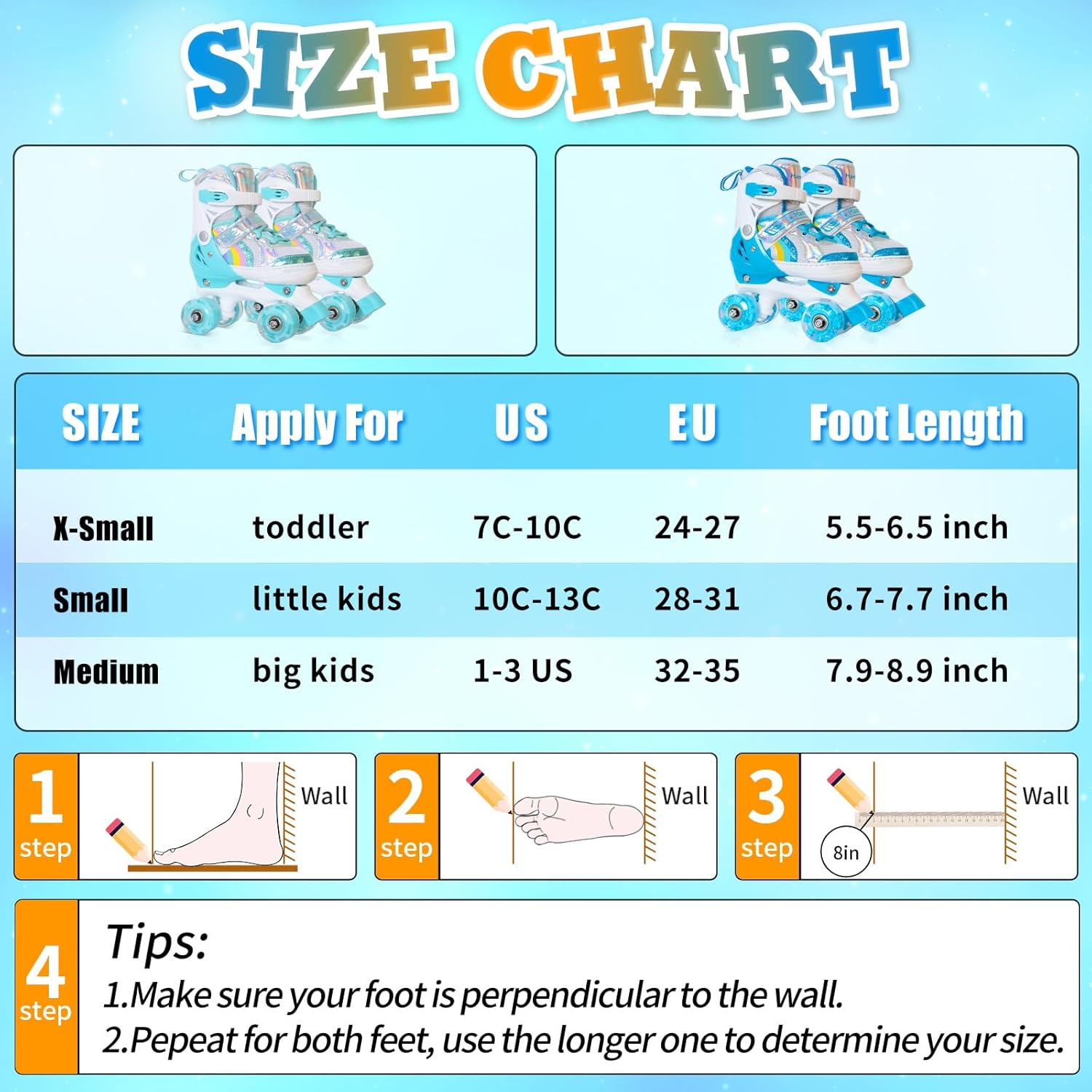 - Patines ajustables: los patines para niños vienen en cuatro tamaños diferentes que son ajustables para crecer con tu hijo, por lo que los niños pueden usarlo durante mucho tiempo aunque sus pies estén aumentando. Hay tres tallas disponibles: XS (7C-9C)/S (10C-13C)/M (1-4). Consulta la imagen de nuestra tabla de tallas para conocer la longitud específica de la bota.