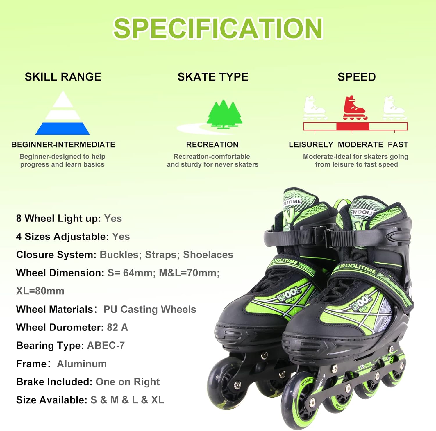 Los patines en línea están disponibles en cuatro tallas: S/M/L/XL, cada una adecuada para diferentes edades y ajustable. Asegúrate de elegir la talla correcta consultando la tabla de tallas. Es cómodo de usar con un botón, incluso para niños. Los zapatos se ajustan perfectamente a los pies en crecimiento de los niños.