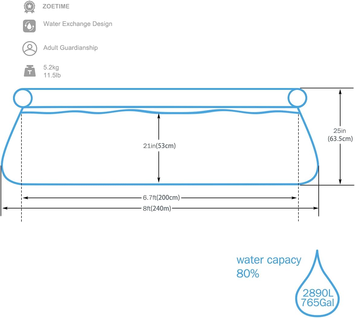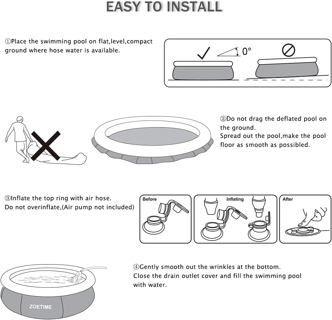 - Instalación rápida: Construido sobre el principio de fijación automática de la suspensión, la piscina inflable Zoetime es rápida de inflar y fácil de almacenar. En tan solo unos minutos, puedes disfrutar de diversión ilimitada.