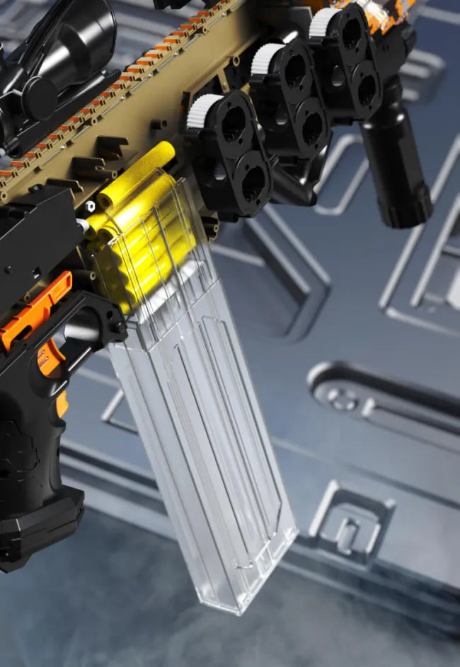 Este bláster es increíble. Vacía su cargador de 40 balas en 3-4 segundos, tiene una punta de culata compatible con Nerf, rieles de visor funcionales.