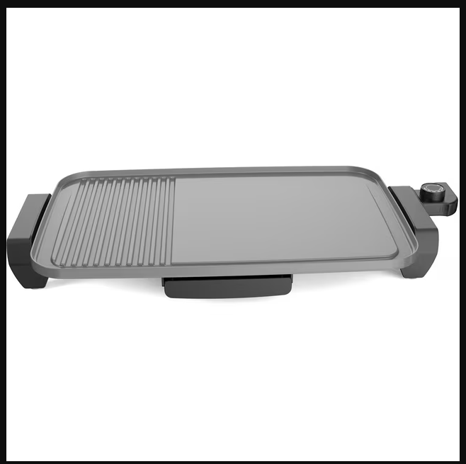 Prepare fácilmente comidas increíbles, desde el desayuno hasta la cena, con la confiable plancha eléctrica de cerámica para interiores Mainstays Plus de 20", antiadherente y con control de temperatura. Esta plancha cuenta con una amplia superficie de cocción de 1500 vatios, 30 cm de profundidad x 50 cm de ancho, con un tercio de ella convenientemente dividido como parrilla, para que pueda cocinar fajitas completas de una sola vez. La duradera superficie de cerámica antiadherente es ideal para todo, desde huevos, tocino y panqueques, hasta verduras salteadas, tortillas y sándwiches de queso a la plancha, y filetes, hamburguesas y pollo a la parrilla. La plancha eléctrica está diseñada en un color gris relajante y complementario, con asas frías al tacto en negro mate, bandeja de goteo deslizable para una limpieza rápida y dial de control de temperatura extraíble. Las temperaturas de cocción varían desde mantener caliente hasta 200 °C. Desde el uso diario hasta ocasiones especiales, la confiable plancha de cerámica Mainstays Plus de 20" es un utensilio de cocina esencial. Pieza para cualquier cocina.