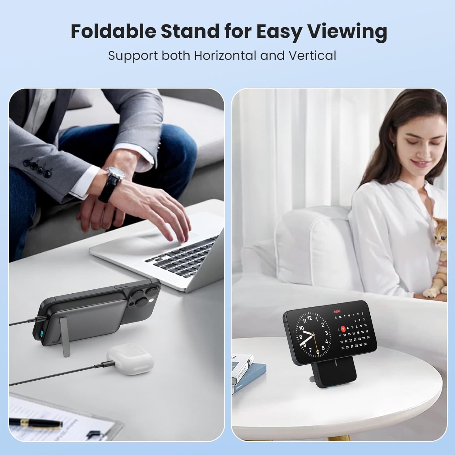 - iPosible power bank inalámbrico con el soporte plegable, puede mantener su iPhone en él verticalmente u horizontalmente para un ángulo de visión cómodo. Puede liberar sus manos para ver videos o hacer videollamadas con amigos. El material de silicona tipo bebé incorporado es para proteger mejor su teléfono de arañazos durante la carga inalámbrica. La batería externa para iPhone sólo mide 2,1x7x10,4 cm, pesa 213 g y tiene un diseño compacto perfecto para llevar.