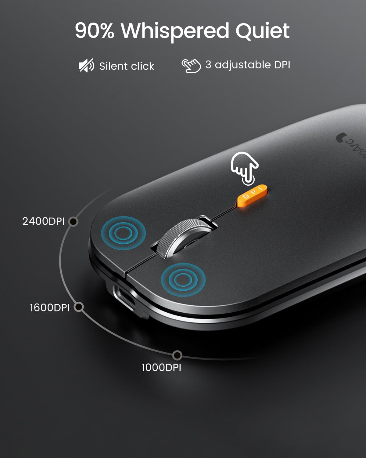 - Cambia hasta 3 dispositivos: el mouse con teclado Bluetooth para Mac se puede conectar a tres dispositivos diferentes simultáneamente a través de sus tres canales Bluetooth. Puede cambiar fácilmente entre los dispositivos haciendo clic en el botón de interruptor de modo.