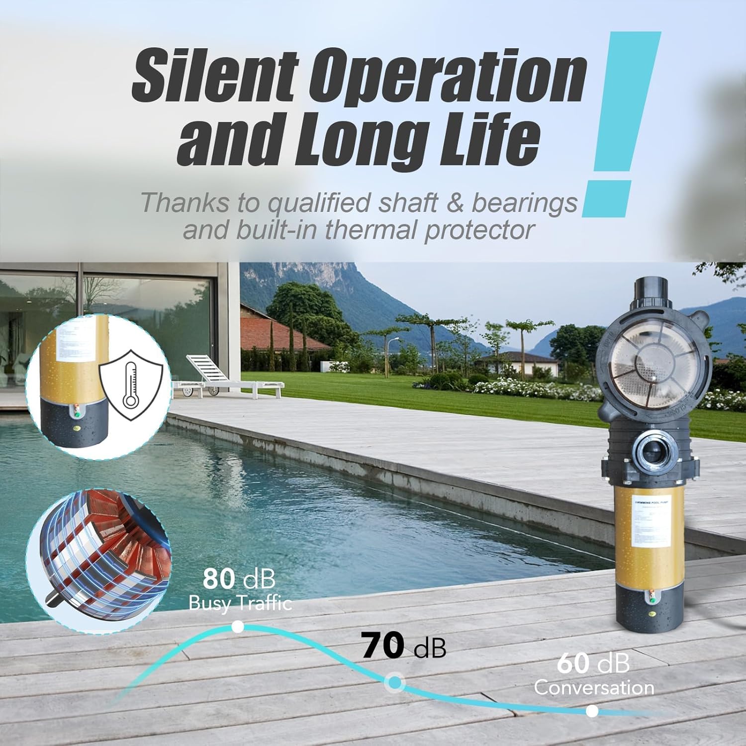 - Súper silencioso: el eje y los rodamientos de acero inoxidable de alta calidad ayudan a reducir el ruido a 60 dB, no escucharás en lugar de rugir del motor. La fuerte succión también permite que la bomba funcione fácilmente con un limpiador de piscinas.