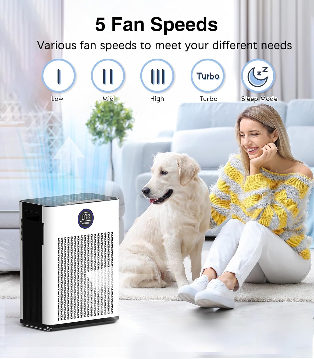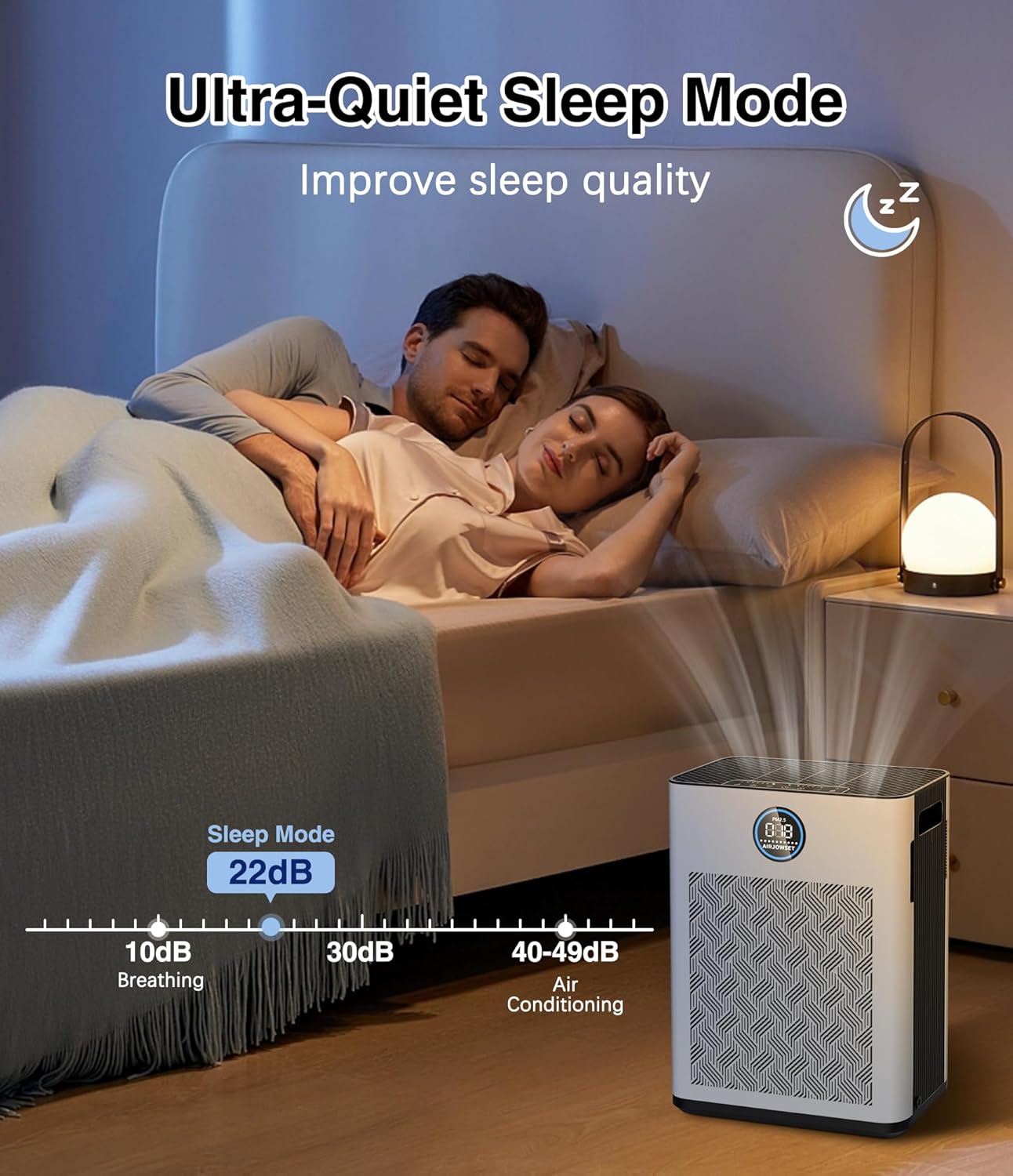 - Modo de sueño silencioso y luces regulables: muchas personas no pueden dormir bien con ruido y luces. Nuestro purificador de aire silencioso para dormitorio resuelve tu problema. El ruido es inferior a 25dB en modo de suspensión. También puede apagar las luces indicadoras por la noche. Te permite a ti y a tu familia tener una noche de sueño dulce con aire fresco y limpio.