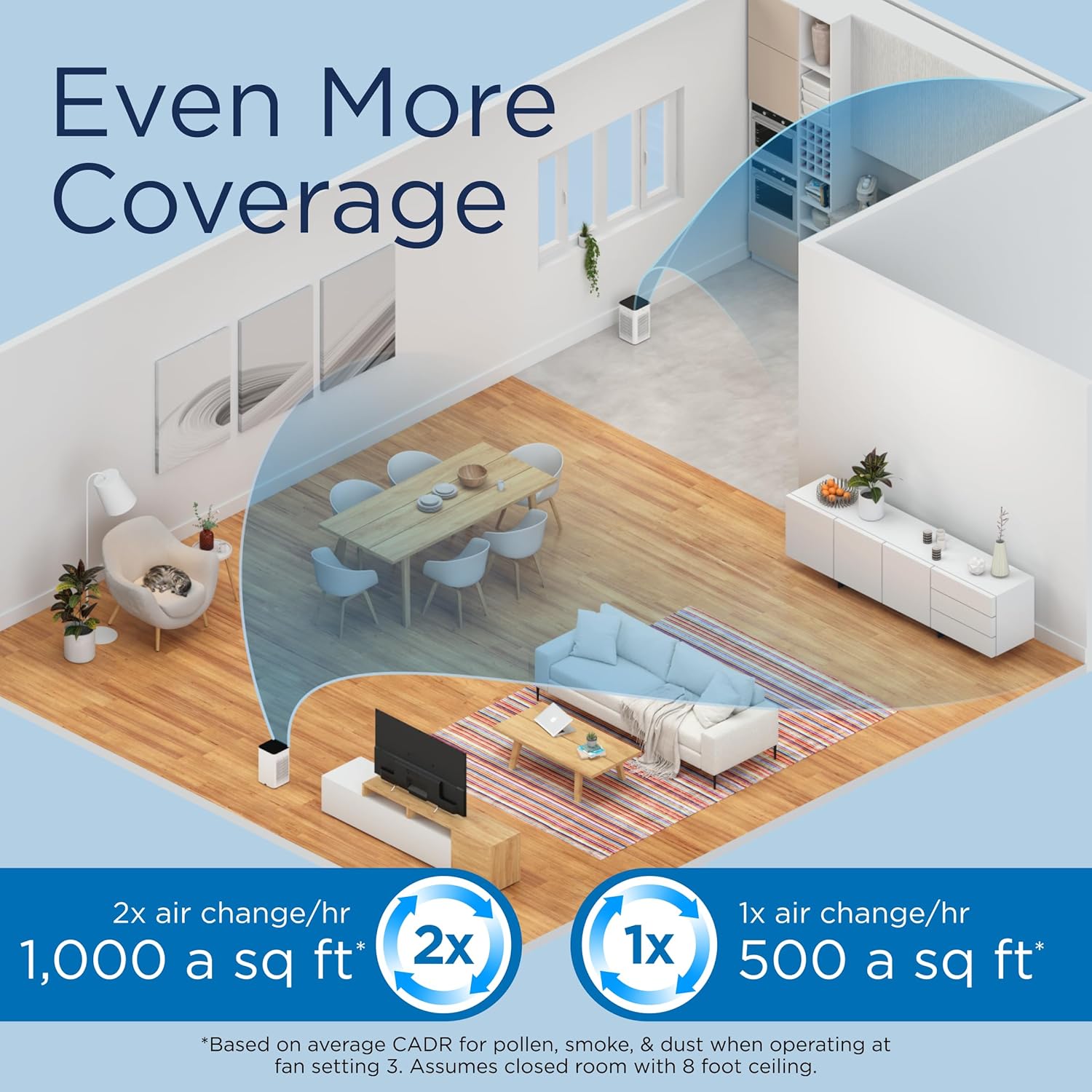 - Mejora la calidad del aire en una habitación de hasta 1.000 pies cuadrados en una hora, 500 pies cuadrados en 30 minutos, 250 pies cuadrados en 15 minutos (CADR 250)