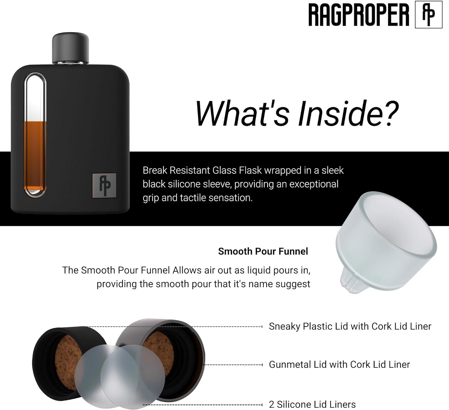 - Juego de regalo de lujo para entusiastas de los espíritus: eleva tu experiencia de beber con el frasco de licor de vidrio de Ragproper. Esta obra maestra combina elegancia y funcionalidad patentada. Incluye funda de silicona extraíble y lavable para mayor comodidad, tapa de metal para pistola, tapa de plástico con forro de corcho y forro de silicona de repuesto. Regalo perfecto para los amantes del whisky, el vodka o la ginebra. Añade un toque de lujo a cualquier ocasión.