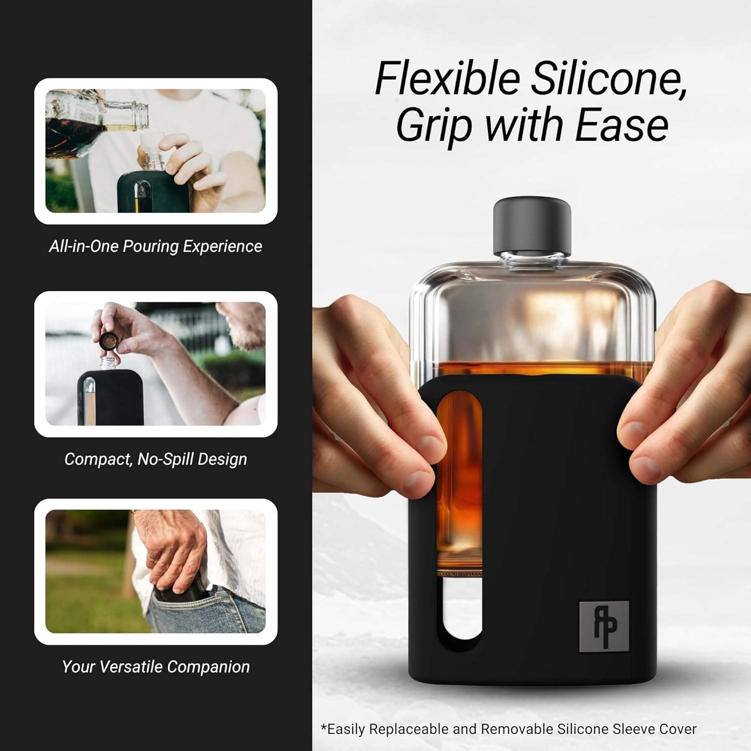 - Patrimonio de Racopropio: reflejando la esencia del término "Ragproper": para vestirse bien, nuestros frascos de 240 ml y 100 ml resuenan con calidad y estilo. Inspiradas en el deseo de mejorar tu experiencia de beber, estas petacas de bolsillo de silicona son perfectas para cualquier persona que aprecie los espíritus finos. Son un regalo considerable, que recuerda a los vasos de alta calidad de una época pasada.