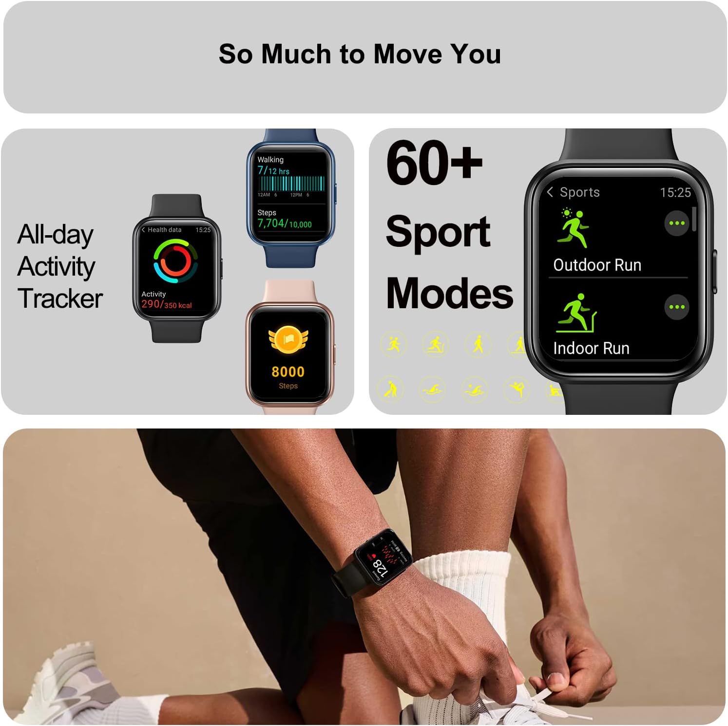 - Más de 60 modos deportivos: este reloj deportivo de fitness tiene más de 60 modos deportivos, puede reconocer automáticamente tu caminar, correr, registrar pasos diarios, contador de distancia, calorías quemadas, minutos activos, medir tu frecuencia cardíaca, saturación de oxígeno en sangre y entender tu estado físico