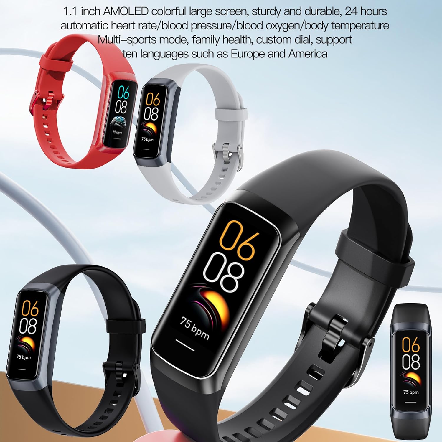 - visualización a color táctil AMOLED de 1.1 pulgadas: la visualización a color táctil AMOLED HD está diseñada con visualización clara y brillante, lo que te proporciona una experiencia táctil y visual de alta calidad. Con el reloj de fitness, también puedes realizar recordatorios sedentarios, recordatorios de agua, despertador, cronómetro, fotos de control remoto, buscar dispositivos, etc. para hacer tu vida más saludable e inteligente. Viene con dos correas de reloj de silicona, que te permiten usarlo fácilmente durante deportes o ocio.