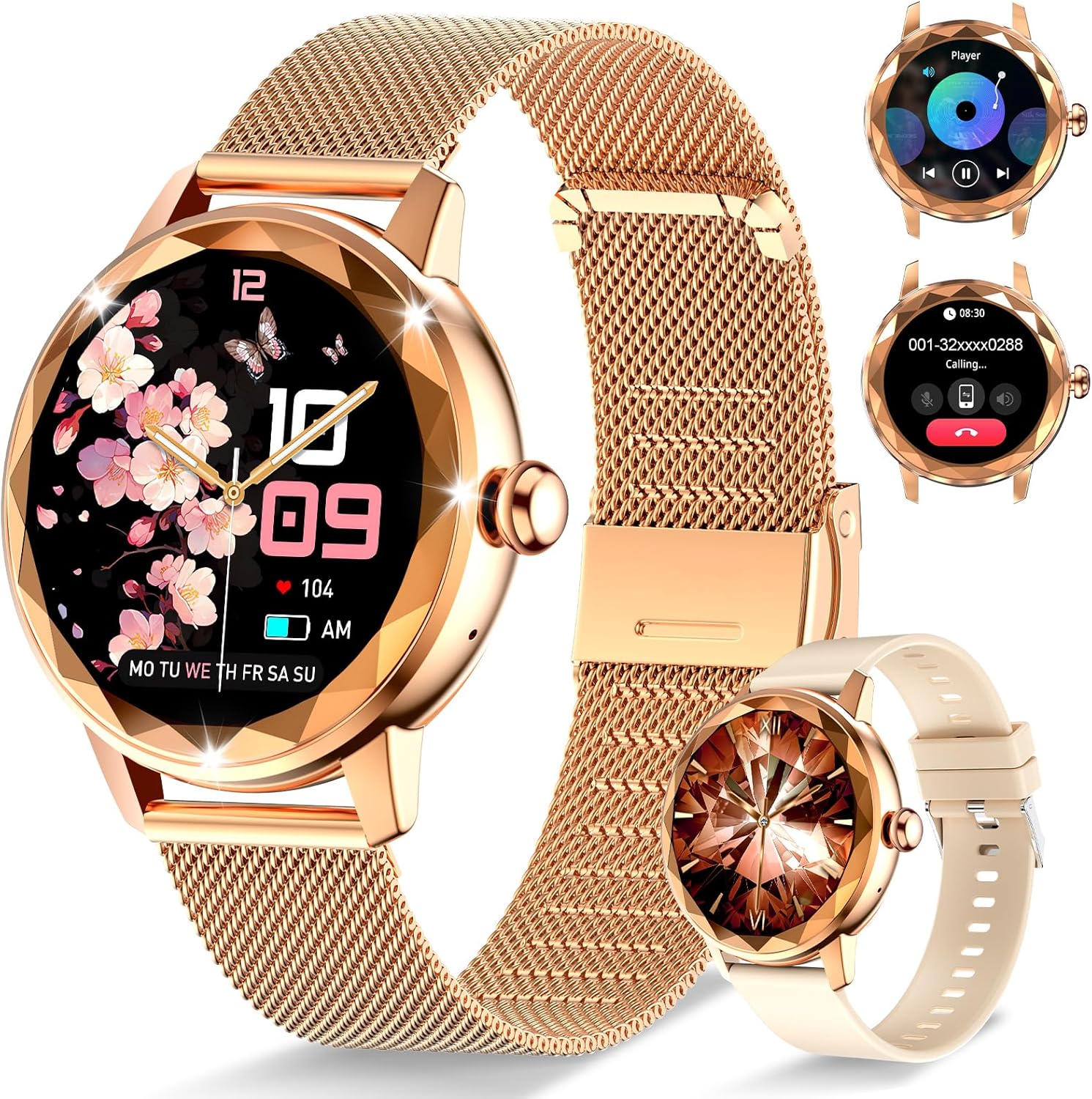 - Como el último reloj inteligente para mujer en 2025, lo hemos equipado con 2 correas de reloj para elegir: la correa de metal es elegante y adecuada para cualquier ocasión diaria, y las correas de silicona son casuales y adecuadas para combinar con ropa deportiva. Además, hay más de 160 estilos de esfera de reloj opcionales, y también puedes subir fotos de acuerdo a tus propias preferencias para personalización personal.