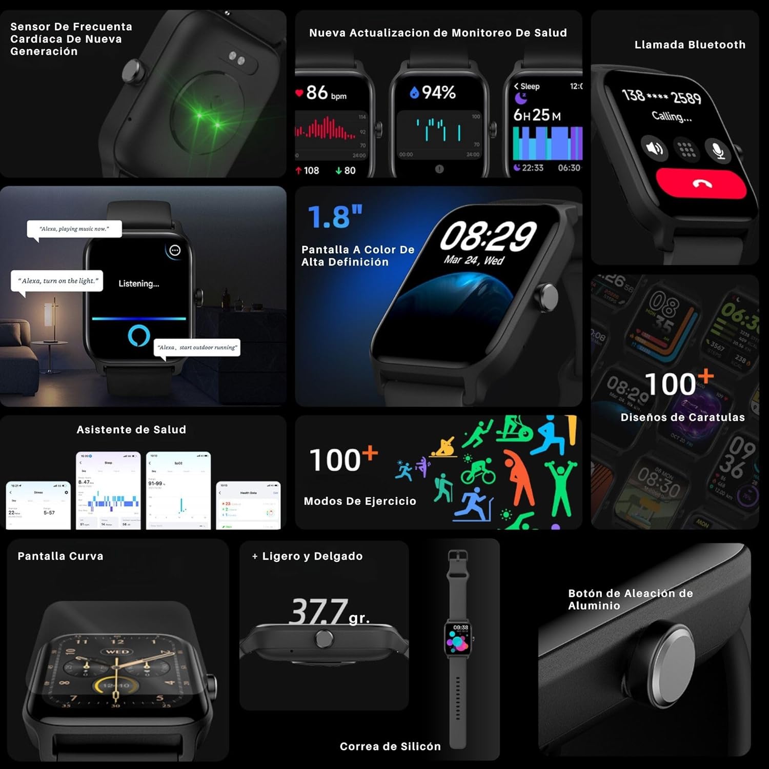 - DISEÑADO PARA RESISTIR Y RENDIR: Este reloj inteligente cuenta con una pantalla curva de 1.8 pulgadas de alta resolución (240*284) que ofrece una experiencia visual nítida y cómoda. Su certificación IP68 lo hace resistente al agua, permitiéndote usarlo bajo la lluvia, en la ducha o incluso al nadar, sin preocupaciones. Con más de 100 modos de ejercicio, desde correr hasta natación, este smartwatch es el compañero perfecto para cualquier actividad física, ofreciendo alertas de oxígeno y seguimiento detallado de tu rendimiento.