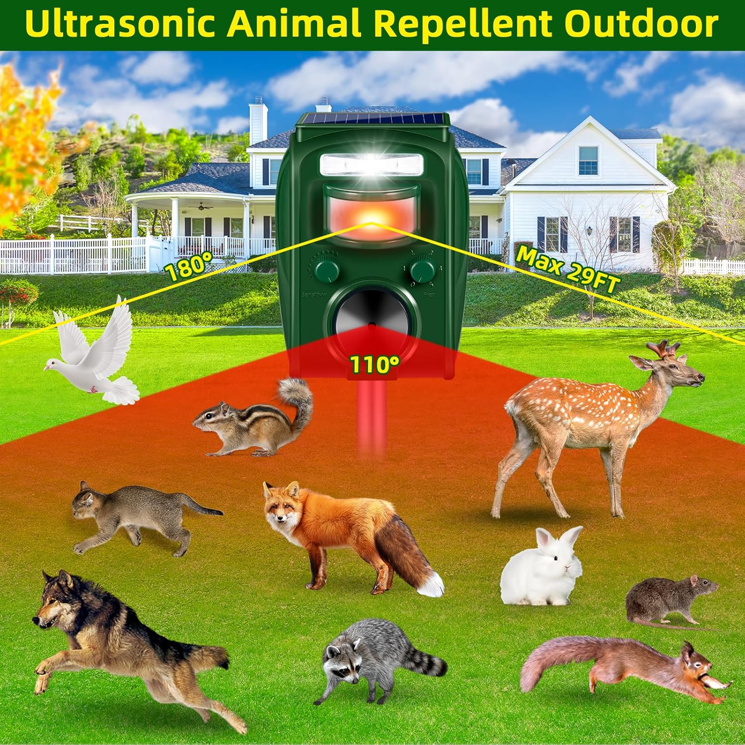 - Eficaz y ahuyenta a los animales de una manera humana: el disuasorio ultrasónico de los animales tiene un sistema de detección de movimiento integrado, que puede detectar movimiento y enviar potentes ultrasonidos y luz LED intermitente, haciendo que los animales se sientan incómodos para conducir animales humanamente, pero no causará ningún daño al cuerpo humano. Sin trampas, sin animales muertos