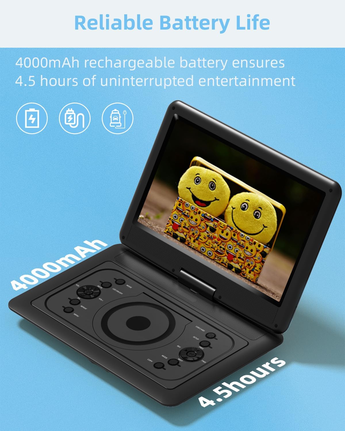 - Libertad cinematográfica con batería de 4 a 5 horas: eleva tu experiencia de visualización con nuestro reproductor de DVD portátil con una duración de batería extendida de 5 horas. Disfruta del entretenimiento ininterrumpido sobre la marcha o en casa, asegurando que nunca te pierdas un momento cautivador de tus películas favoritas. Ya sea un viaje por carretera o un maratón de películas, este dispositivo portátil te mantiene sumergido sin necesidad de carga constante. ¡Abraza la libertad cinematográfica con una reproducción prolongada!