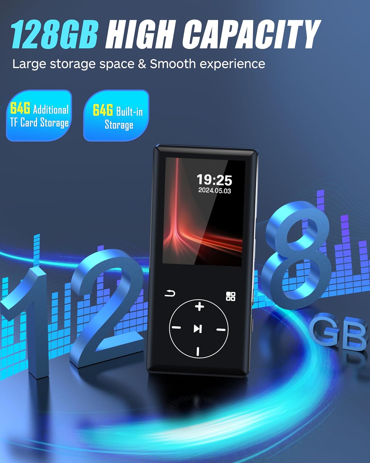- Este reproductor de MP3 AFU con Bluetooth tiene una memoria integrada de 64 GB y soporta hasta 256 GB de expansión de tarjeta de memoria (incluida la tarjeta micro SD de 64 GB). Admite formatos de música como MP3, WMA, WAV, APE, FLAC, AAC-LC, M4A, OGG, etc., para que puedas poner tus canciones favoritas y crear tu propio espacio musical. La batería integrada de 450 mAh solo tarda 2 horas en cargarse y tiene una duración de batería de hasta 30 horas.