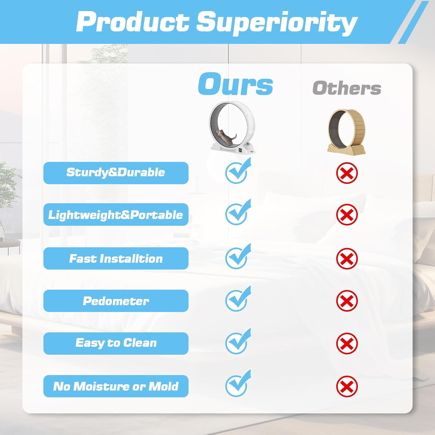 - Instalación súper rápida: en comparación con el tiempo de instalación de 1 a 2 horas de las ruedas de ejercicio tradicionales de madera para gatos, la rueda para gatos ofrece una instalación rápida y fácil en solo 10 minutos, lo que ahorra mucho tiempo y evita el trabajo de instalación pesado