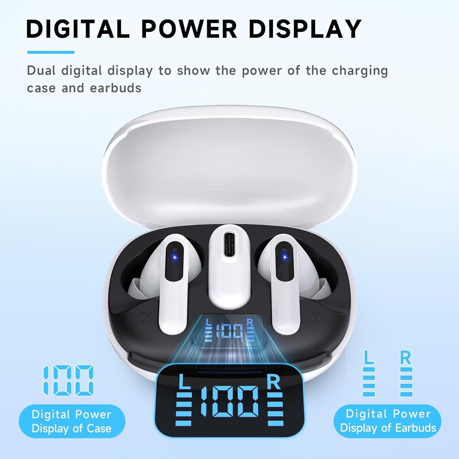 - Pantalla de alimentación LED y reproducción de 36 horas: La pantalla de alimentación LED digital dual dentro de la carcasa es para mostrar el nivel de potencia para la funda de carga y los auriculares. Al cargar la funda, la luz LED comenzará a parpadear de 1 a 100. La funda de carga de la batería de 500 mAh puede proporcionar una carga completa adicional de 3.5 veces para ambos auriculares, cada auricular inalámbrico Bluetooth puede durar 8 horas con una sola carga. Por lo tanto, puede disfrutar de 36 horas de tiempo de música en total a través del uso a su vez.