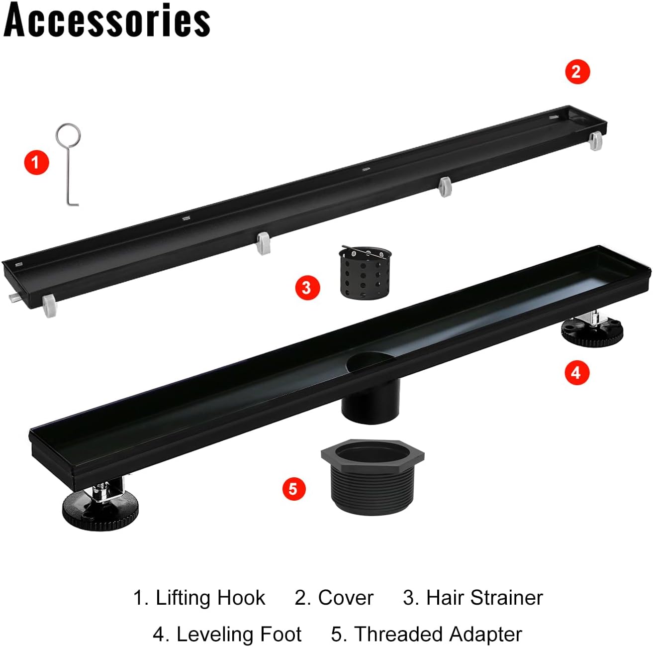 - Descripción de los accesorios: Abra el panel desde ambos lados del desagüe de ducha lineal usando un gancho, el colador puede filtrar el cabello y las impurezas de partículas de manera efectiva. Los pies ajustables pueden resolver el problema de instalación causado eficazmente por las irregularidades del suelo. Juntas roscadas con anillo de goma para ajustar la altura del desagüe. Se puede utilizar con todos los accesorios de drenaje de PVC, ABS y hierro fundido de 2 pulgadas en el mercado para asegurar el drenaje a la brida y evitar el agua.