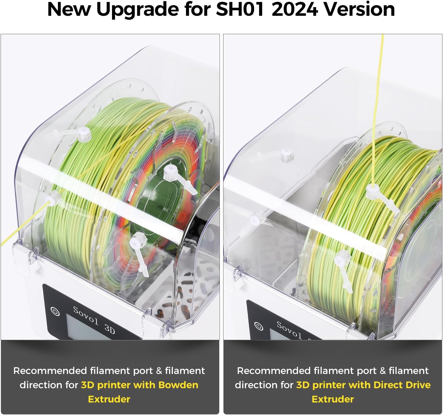 - Elimina el exceso de humedad: los filamentos para impresión en 3D son higroscópicos; la humedad causaría fallos en la impresión. La SH01 de Sovol es un genial añadido para tu impresora 3D porque puede eliminar el exceso de humedad, mantener tu filamento seco y ofrecerte mejores impresiones. La superficie de las impresiones será más lisa, y la adhesión de las capas aumentará.