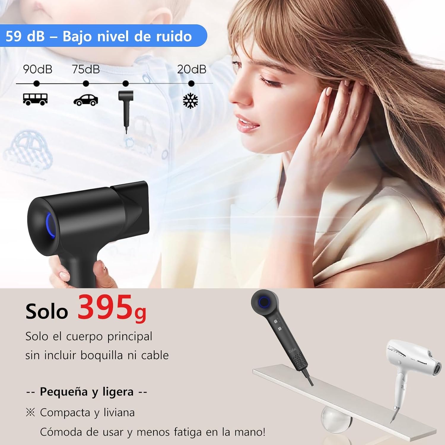 - Diseño silencioso y ligero: este secador de pelo portátil de viaje está equipado con una tecnología de reducción de ruido única que puede ajustar la frecuencia del ruido del motor dentro de un rango determinado. Es fácil de sostener y pesa solo 395 gramos de uso doméstico.