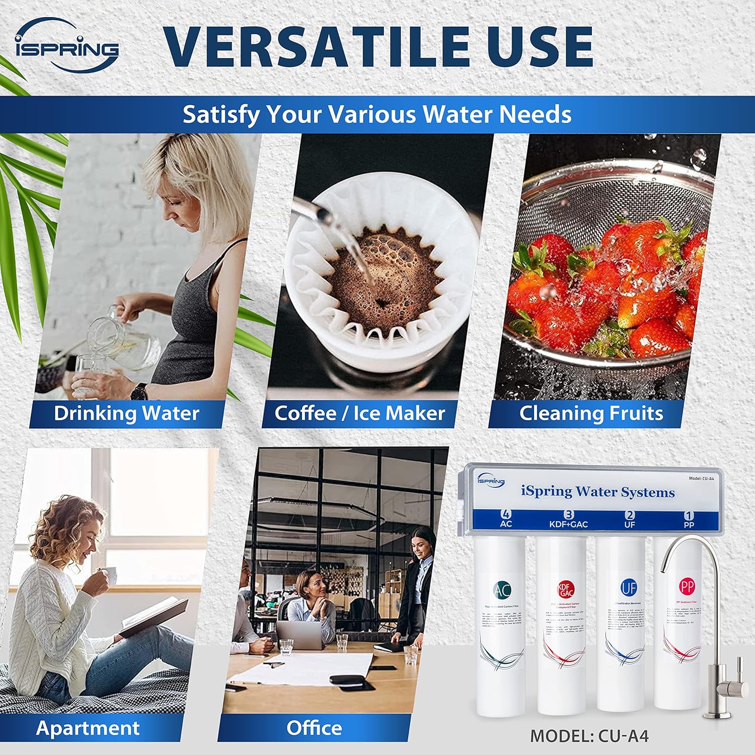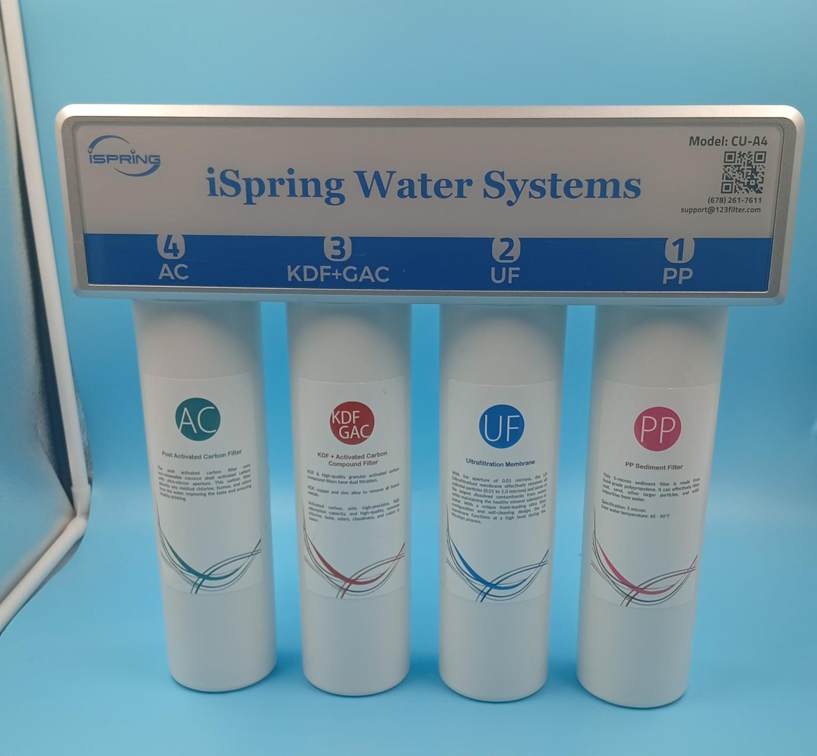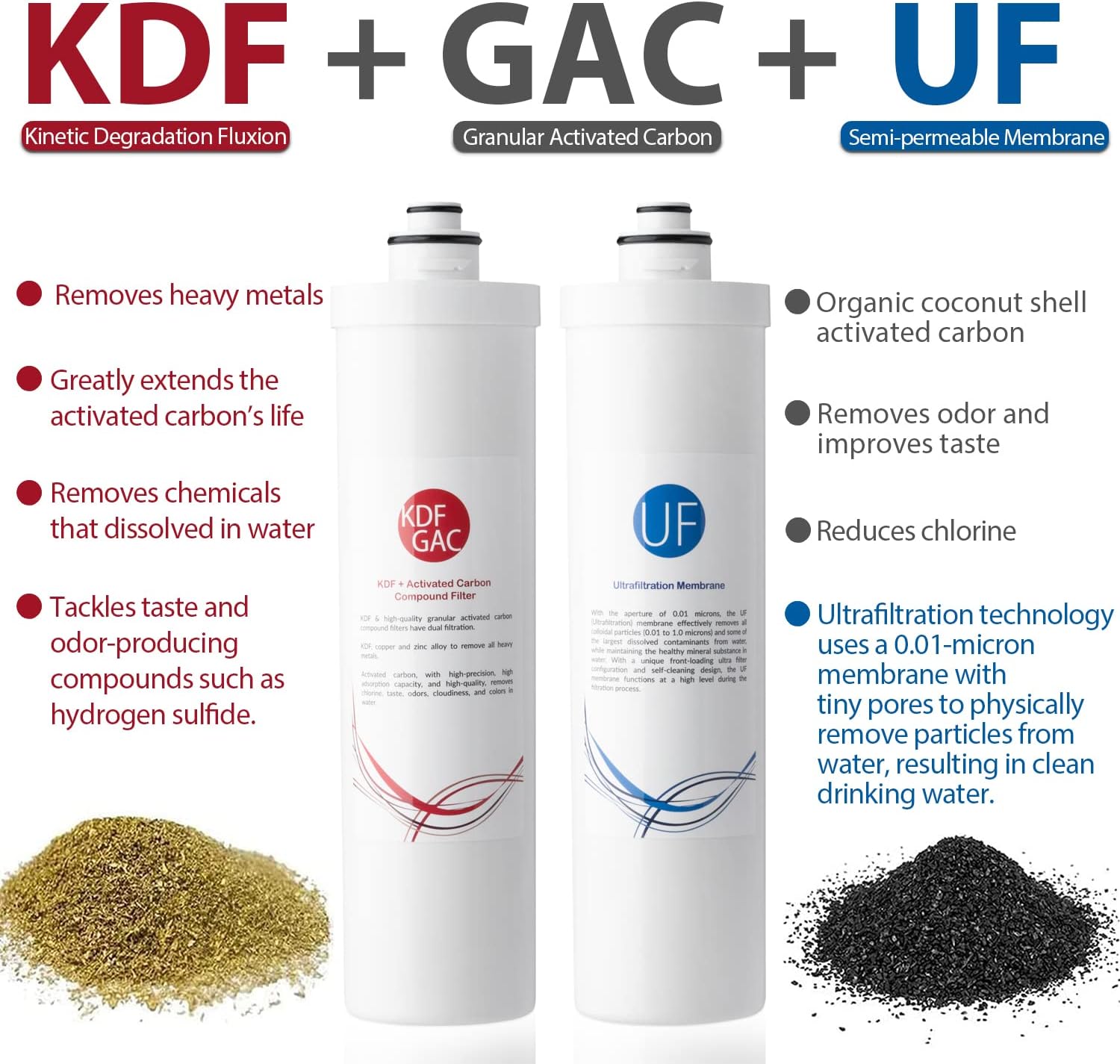 - Filtración de 4 etapas PP+UF+AC+KDF: rechaza hasta el 99 % de contaminantes como cloro, TTHM, COV, plomo, arsénico, metales pesados y microorganismos.