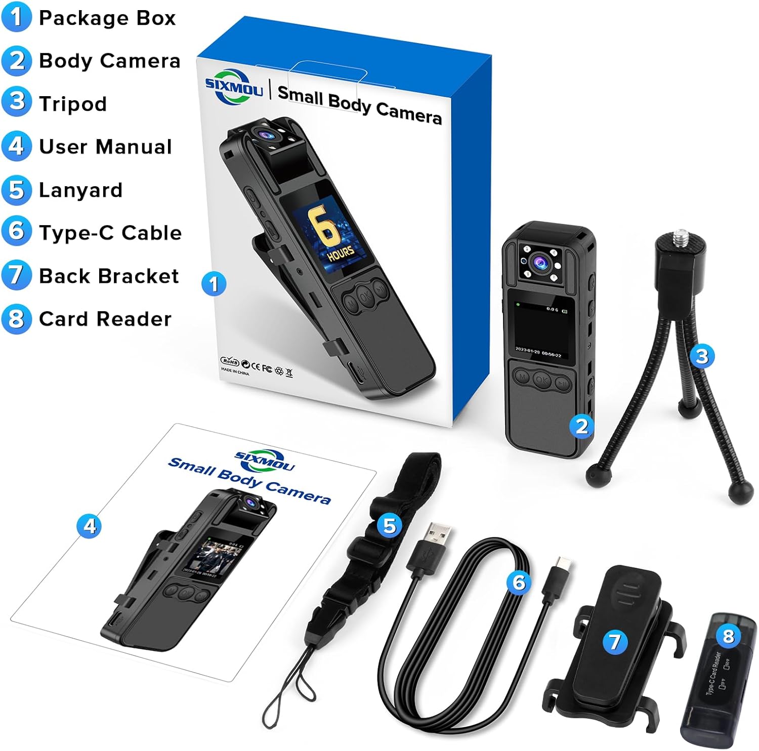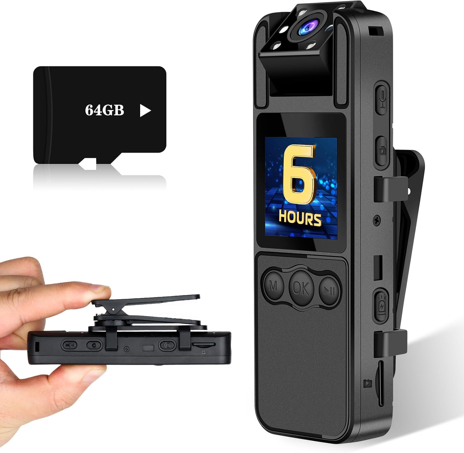- Tarjeta de memoria de 64 GB incluida: La cámara portátil Sixmou B9 viene con una tarjeta MicroSD de alta velocidad de 64 GB preprobada para garantizar una grabación de video fluida. Puede almacenar aproximadamente 10 horas de archivos de vídeo. No se requiere ningún costo adicional.