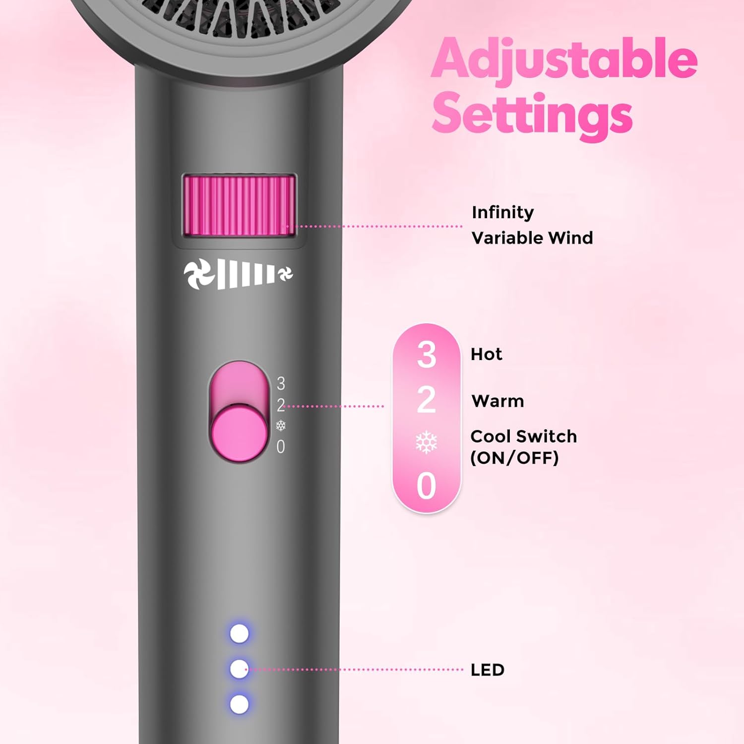- Ahorra tiempo y sin daños por calor: el secador de pelo está construido con 1600 W, con 3 ajustes de calor (frío/cálido/caliente). Hay un botón de ajuste de velocidad continuo, que puede ajustar la velocidad del viento arbitrariamente, con ajuste de velocidad infinita del viento. Fácil de controlar la temperatura y la velocidad del viento para hacer tu peinado favorito en casa.