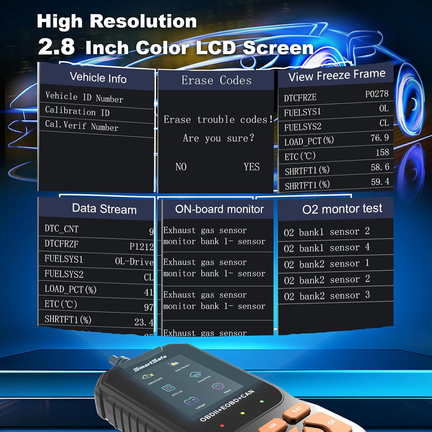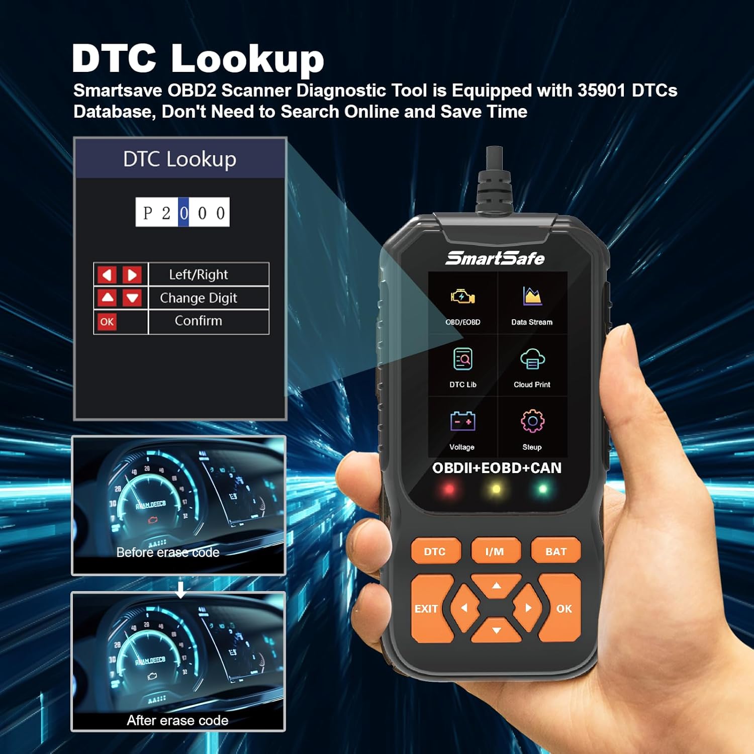 - ✔Herramienta de diagnóstico OBD2 completo: el lector de código de coche SmartSafe plug-and-play tiene 35901 DTC incorporado, código de lectura/borrado, ver marco congelado, información del vehículo, transmisión de datos en vivo (gráfico y registro), lectura I/M preparación, recuperación de vehículo Vin, sensor O2, prueba de monitor a bordo, búsqueda de código de falla, voltaje de la batería.