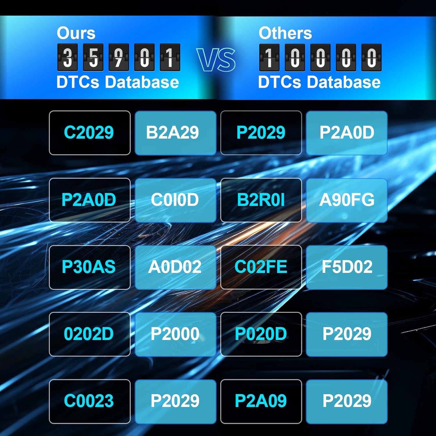 - ✔ DTCS 35901 integrado para búsqueda: con chip mejorado, nuestra herramienta de diagnóstico profesional OBD2 tiene más completa y más DTC (35901 DTC, en comparación con otros que solo tienen 3.000-10.000). Después de completar la inspección, el escáner del coche mostrará directamente el código de falla y los significados basados en la base de datos integrada.