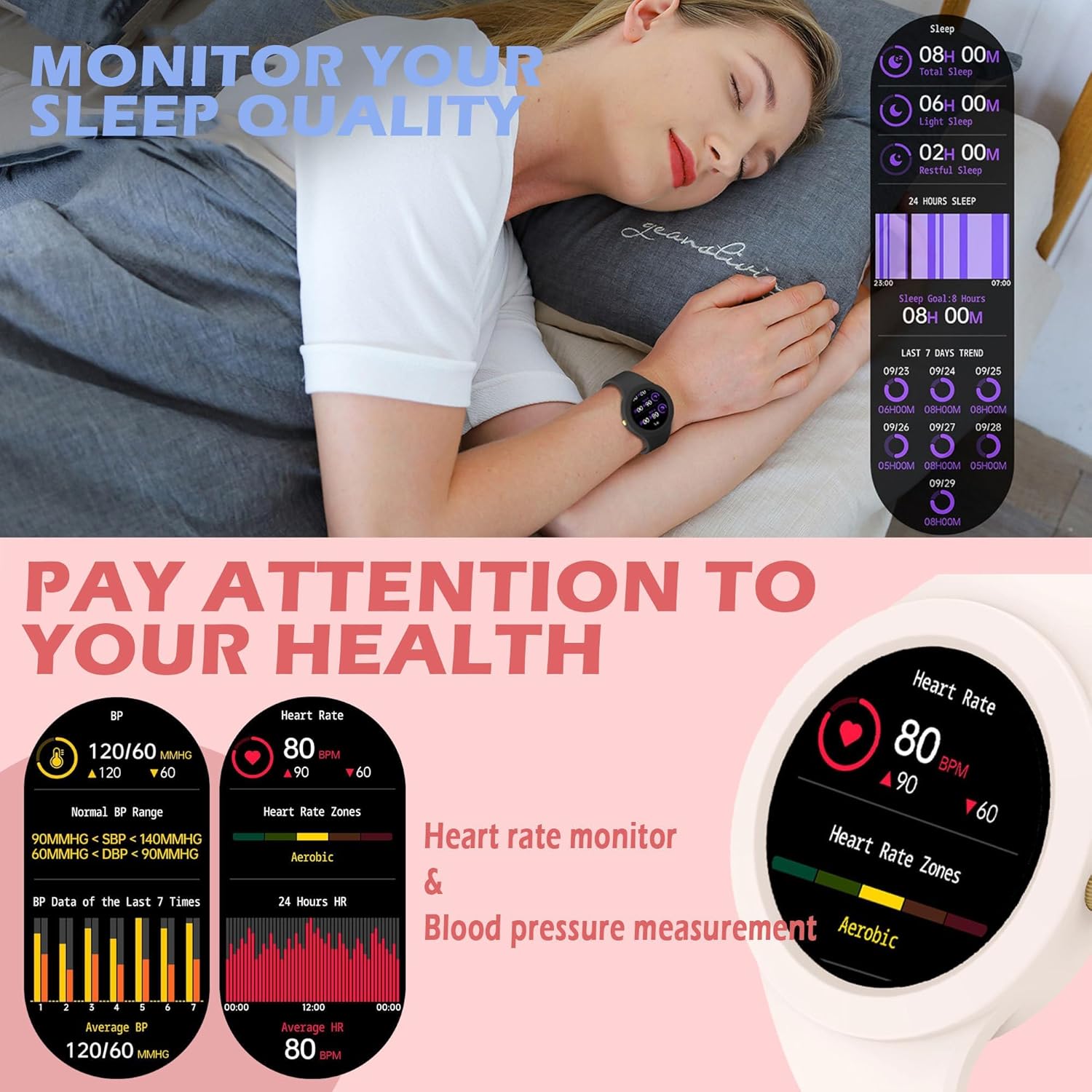 - Monitoreo de frecuencia cardíaca: sensor óptico dinámico de frecuencia cardíaca de alto rendimiento y baja potencia, a través del sensor de luz verde, mide rápidamente tu frecuencia cardíaca. También puedes activar la medición de frecuencia cardíaca temporizada. Te permite comprender mejor tu salud. Conoce tu sueño: puede rastrear tu estado de sueño. Monitorea automáticamente el sueño por la noche, registra la duración del sueño, analiza los datos del sueño y la profundidad del sueño.