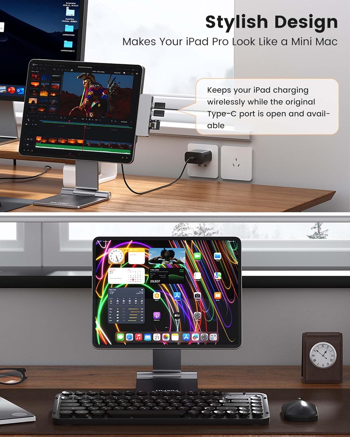 - El primer soporte magnético de carga inalámbrica para iPad: di adiós a los cables desordenados y a las configuraciones complicadas. Nuestro soporte de carga inalámbrico magnético mejorado añade conectores inteligentes Pin y un puerto USB-C para una carga sin problemas. Simplemente coloca tu iPad en el soporte magnético, conecta el cable de carga USB-C y disfruta de una carga rápida de hasta 18 W. Mantén tu iPad encendido y listo para funcionar en todo momento