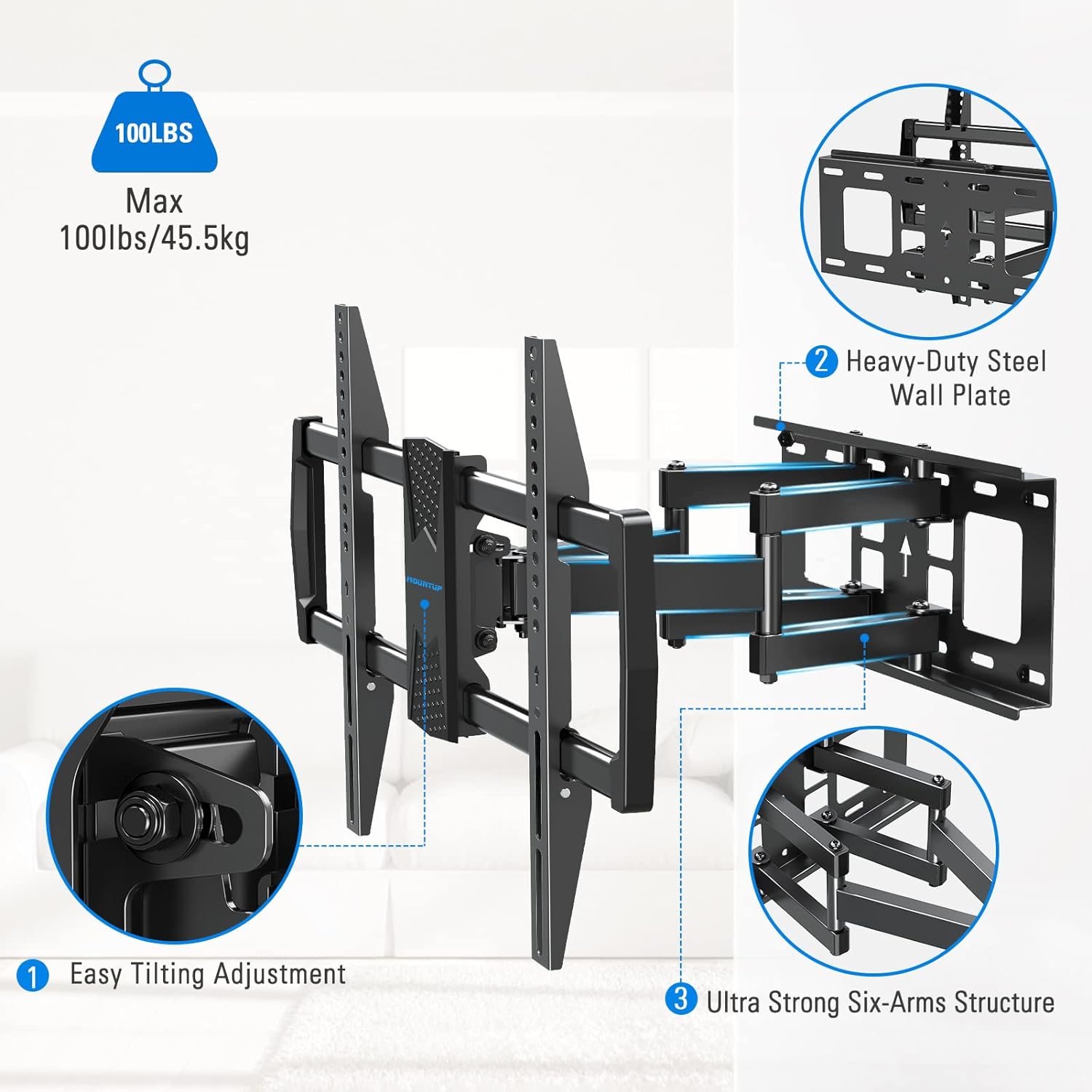 MOUNTUP MU0028-24K - Soporte de pared para la mayoría de televisores de 42 a 82 pulgadas, se adapta a pernos de 16 pulgadas, 18 pulgadas o 24 pulgadas, soporte de TV de movimiento completo con brazos.
