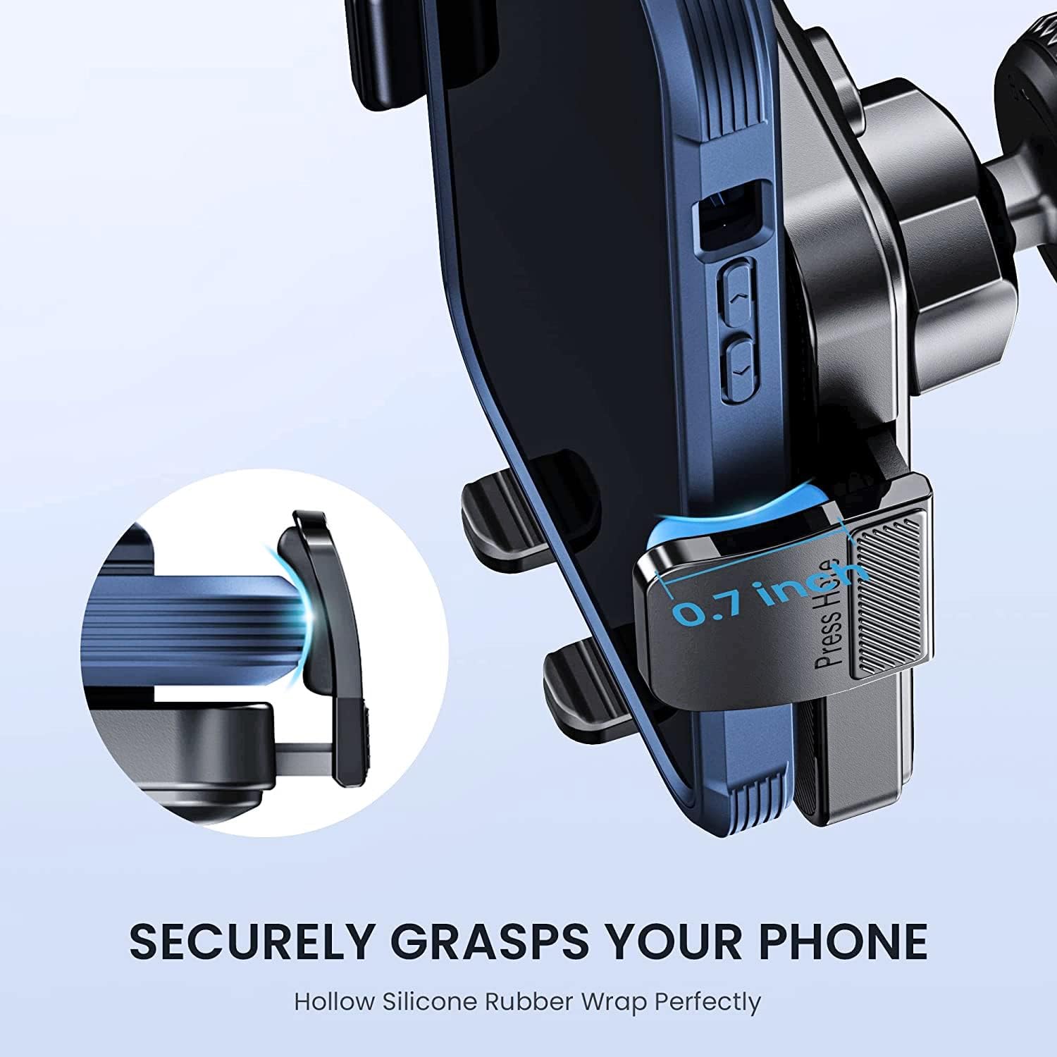 - Nunca se cae: el soporte de teléfono para automóvil está hecho de innovadora goma de silicona hueca, que es más fuerte que otras gomas de silicona ordinarias y envuelve firmemente el teléfono para evitar que se resbale.