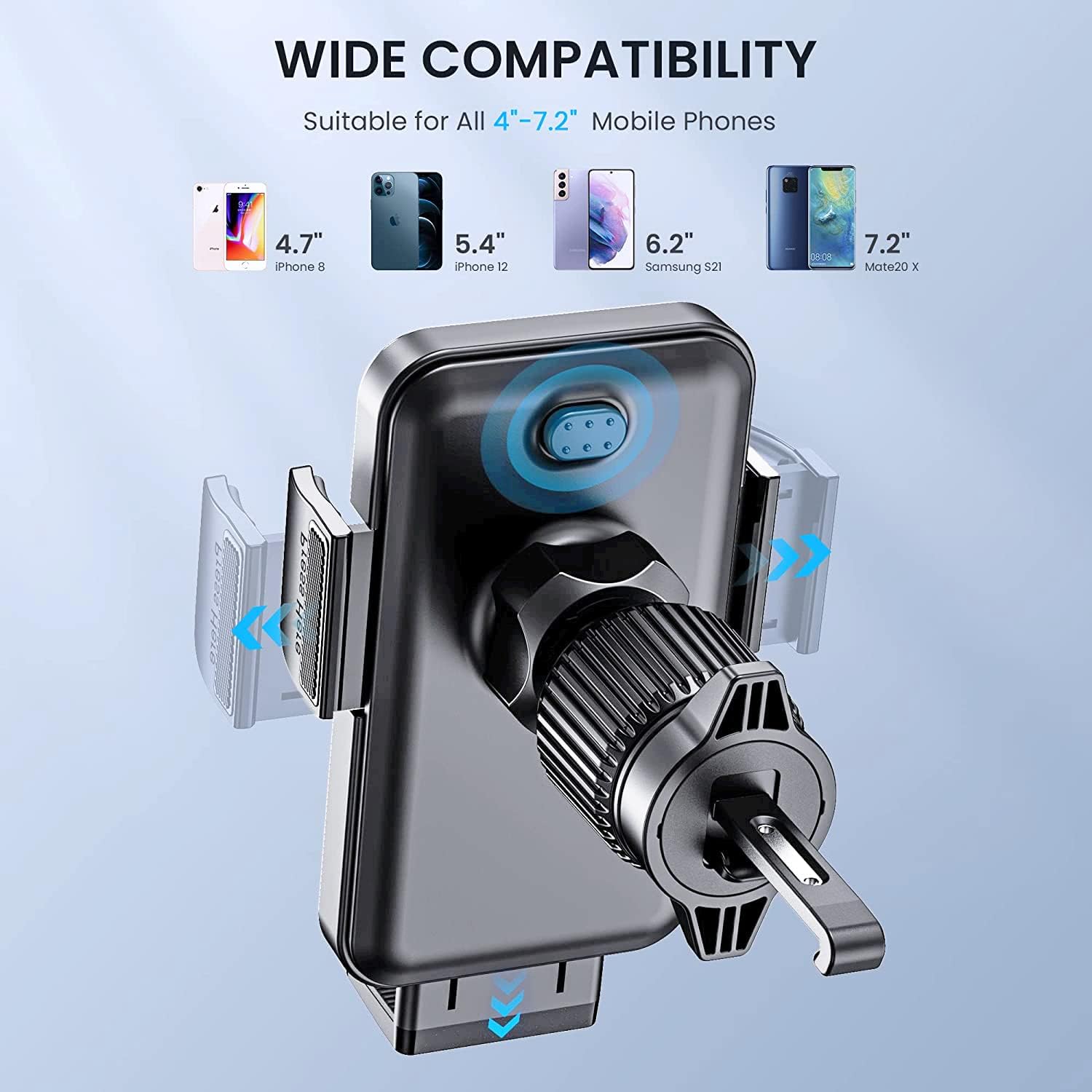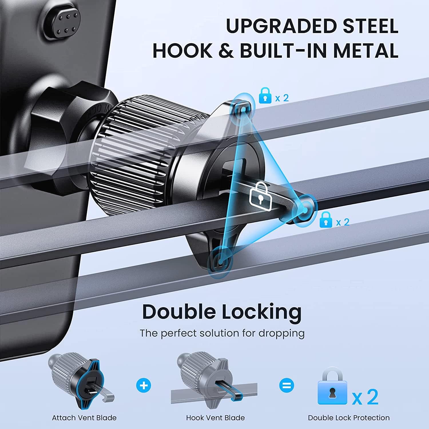 - Gancho de metal mejorado: el material del gancho de montaje para teléfono para automóvil es de metal resistente, asegurando que el clip del gancho de montaje del automóvil no se rompa; la superficie exterior está envuelta con una gruesa capa de silicona para proteger perfectamente las cuchillas de escape; Nota: la longitud del clip es ajustable girando la perilla de ajuste.