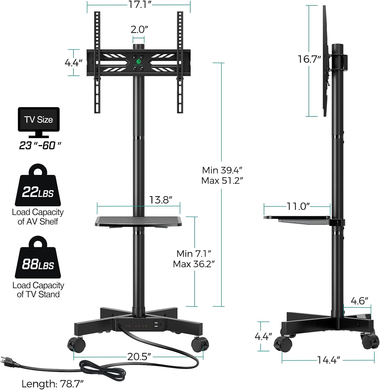 GREENSTELL - Soporte de TV con Toma de Corriente, Carrito de TV móvil con Ruedas para televisores LED LCD de 23 a 60 Pulgadas, visualización Plana Curvada, hasta 85 Libras, Soporte de TV con Altura.