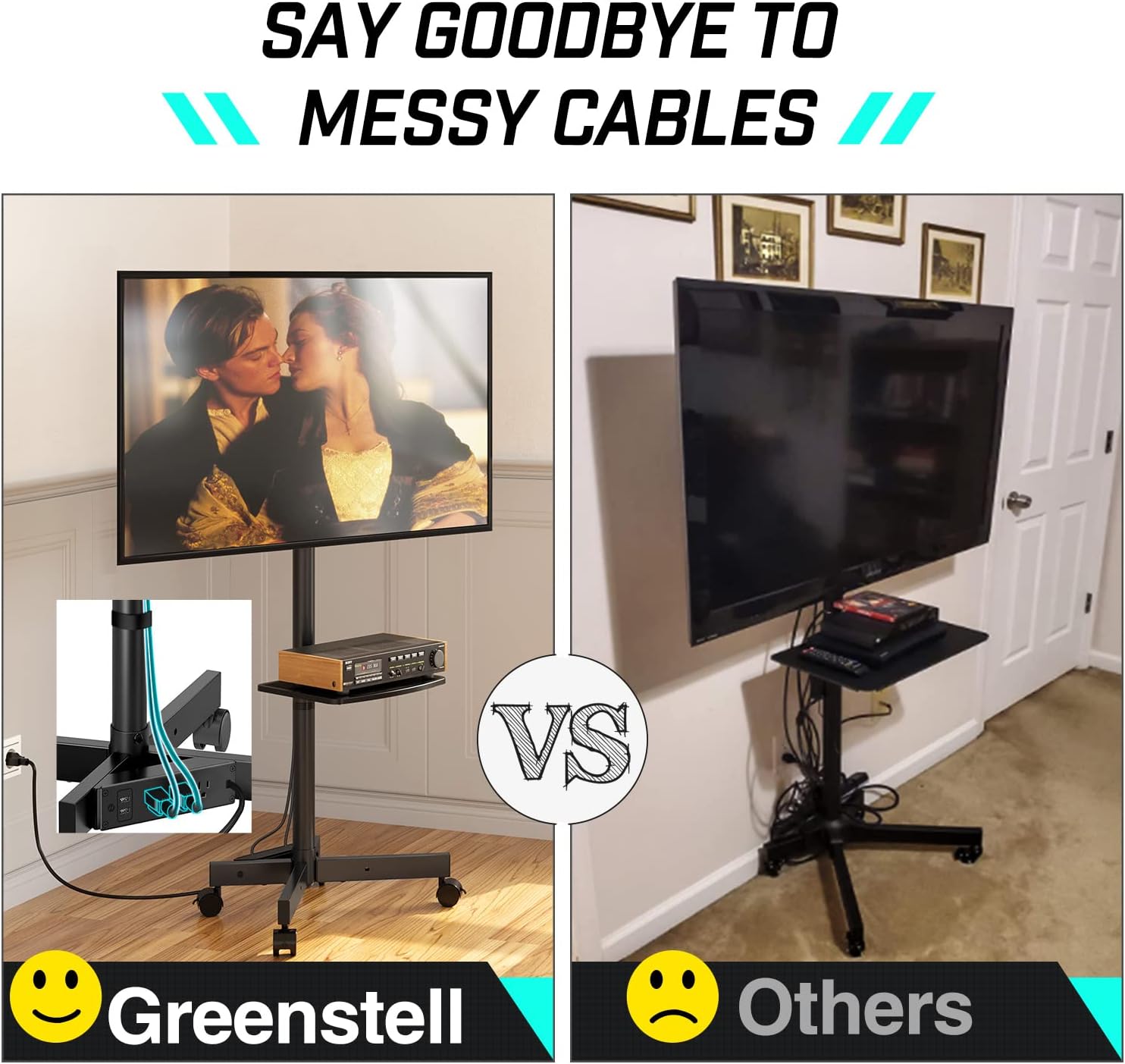 - Toma de corriente y gestión de cable: el soporte de TV portátil Greenstell está equipado con 3 tomas de corriente alterna, 2 puertos USB y cable de alimentación de 6.5 pies de largo. Además de 3 gestiones de cables para mantener los cables organizados y ordenados. No más cables desordenados o cables enredados