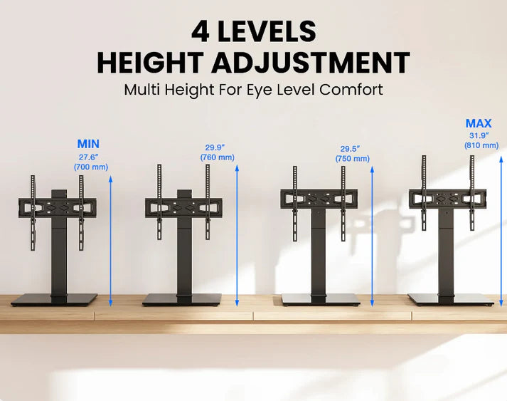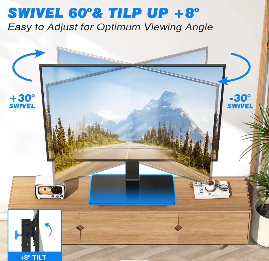 El soporte para TV se integra a la perfección y luce como un accesorio original. Una vez montado, el soporte VESA gira 30° a la derecha o a la izquierda para ofrecer una amplia gama de ángulos de visión. Además, ofrece una función de inclinación con un rango de ángulo de 0° a +8°, lo que permite ajustar la orientación vertical para una experiencia visual óptima. Este soporte para TV de 75 pulgadas le permite elegir fácilmente la posición de visualización más cómoda y ver la televisión desde cualquier lugar de la sala. Además, ofrece más opciones para la mesa donde se coloca.