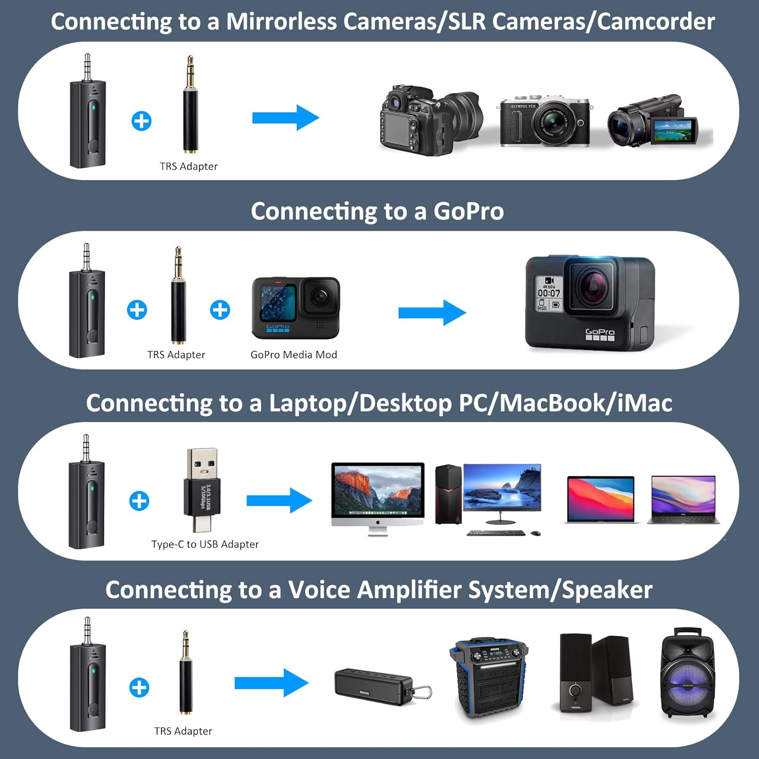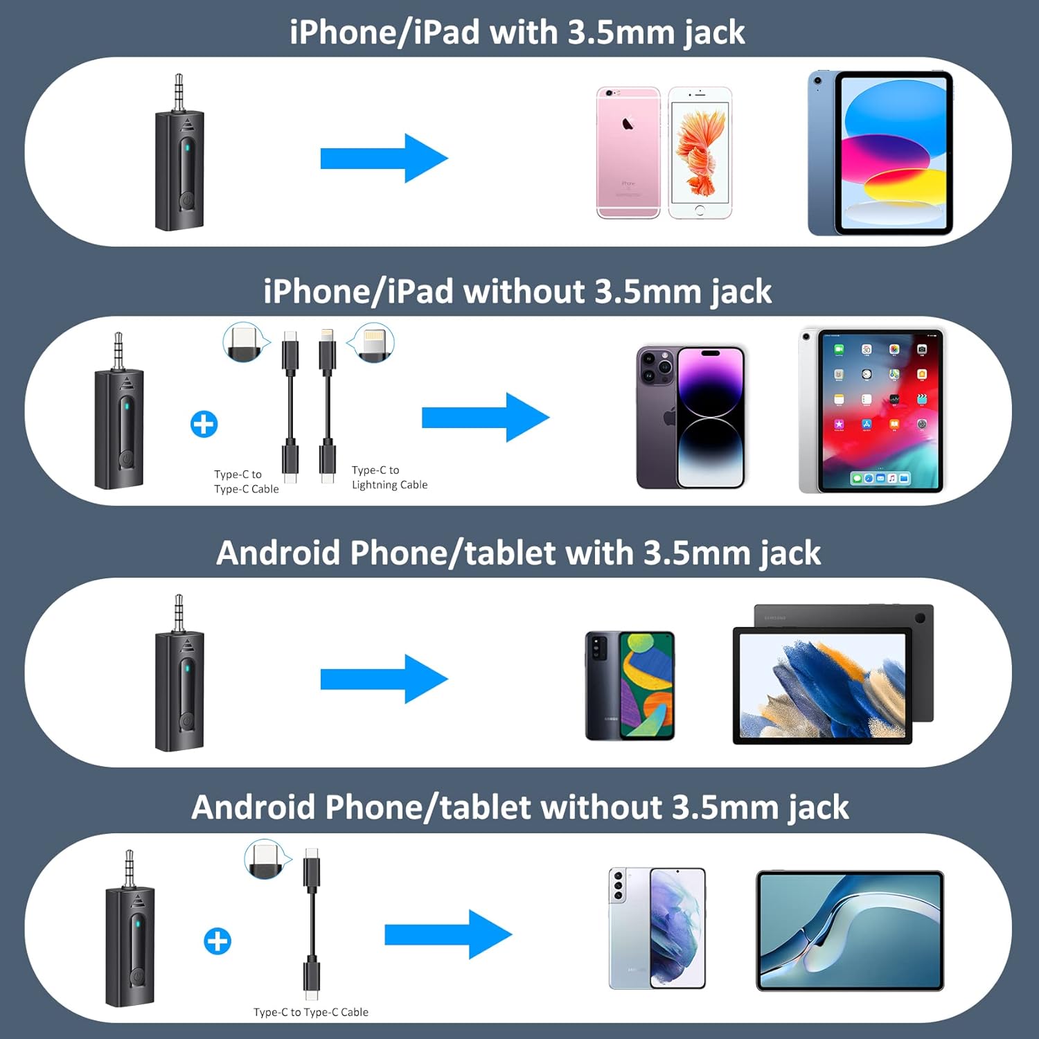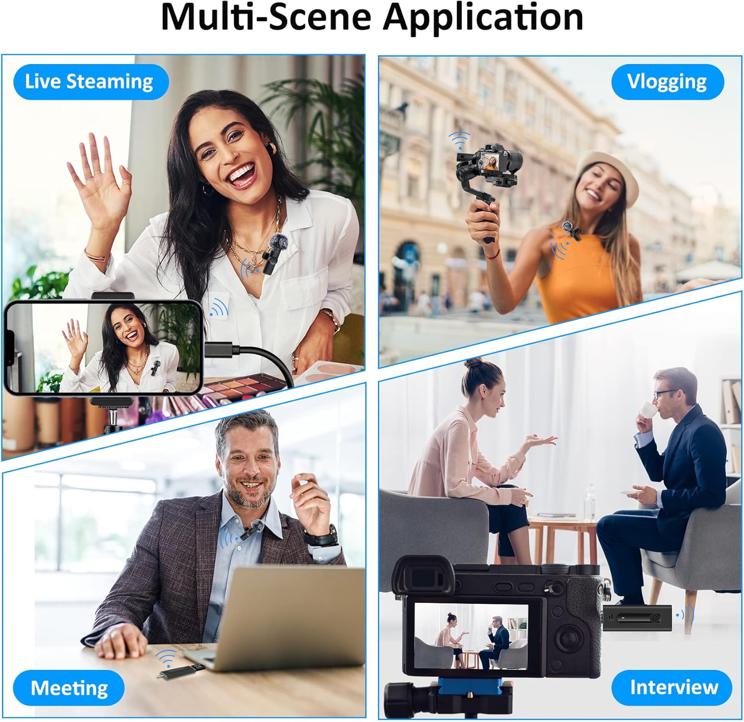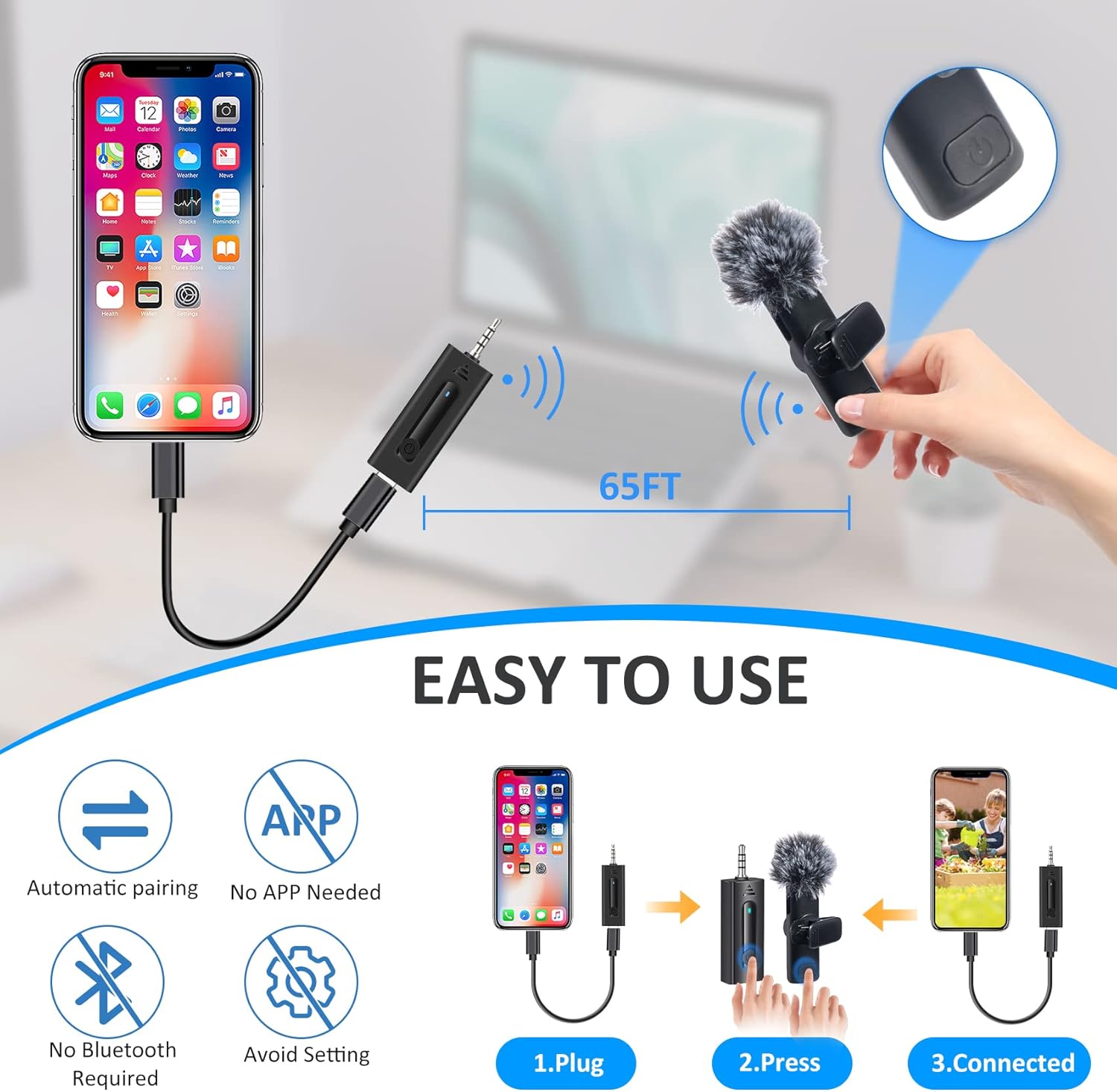 - Conexión automática y fácil de usar: nuestro micrófono de solapa inalámbrico tiene un diseño plug-and-play que hace que sea fácil comenzar. Simplemente conecta el receptor a tu dispositivo a través de un cable Lightning, cable tipo C, puerto USB de 3,5 mm y los micrófonos inalámbricos se conectarán automáticamente. No se requiere instalación de controladores ni descarga de aplicaciones, por lo que es una opción increíblemente fácil de usar.