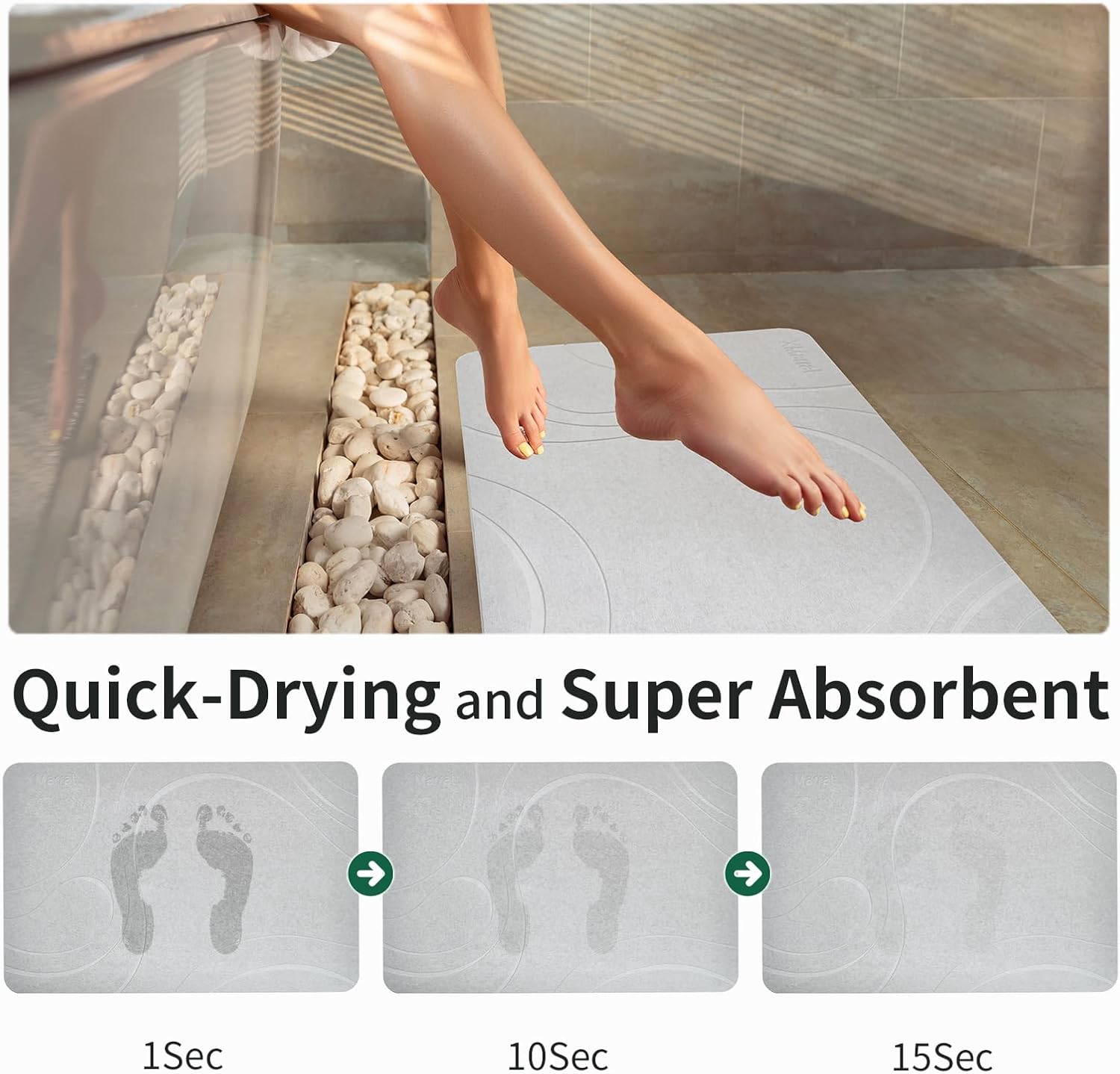 - Secado ultrarrápido: ¡Di adiós a los suelos húmedos y resbaladizos! Nuestra alfombra de baño de tierra de diatomeas natural tiene una absorción notable y propiedades de absorción de humedad que evaporan rápidamente el agua de la superficie, manteniendo tu baño seco y seguro.