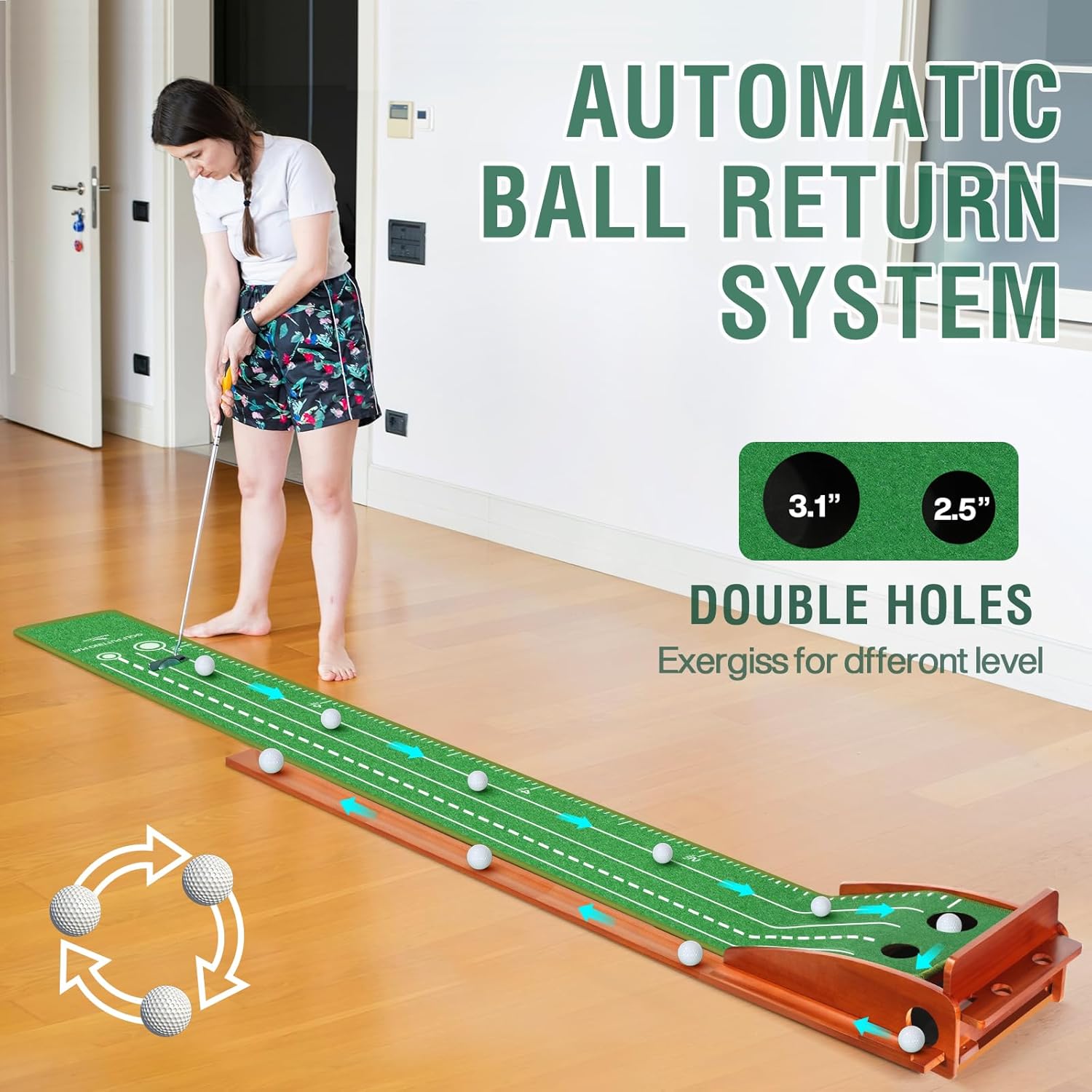 - Sistema automático de devolución de bola: la alfombrilla de práctica perfecta tiene una base de madera maciza para simular la pendiente del campo de golf y está equipada con un sistema automático de retorno de bola. La pelota volverá al punto de golpe a lo largo de la pista automáticamente después de cada swing, sin necesidad de agacharse para recogerla repetidamente, lo que efectivamente nos ahorra tiempo de práctica y nos permite centrarnos más en el entrenamiento del juego.