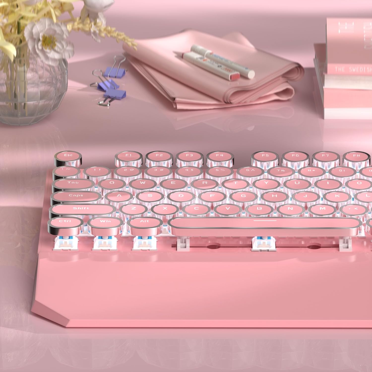- Teclado mecánico estilo máquina de escribir retro: es un teclado rosa lindo y divertido, la tecla redonda punk chapada con un hermoso interruptor azul que hace que escriba sea agradable, como una máquina de escribir.