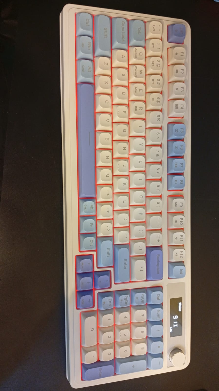 - Perilla dedicada y pantalla de visualización: el teclado de la máquina de escribir admite ajustes de volumen y luz y se puede cambiar libremente entre el modo de juego dinámico con retroiluminación RGB y el modo de oficina de escritura silenciosa. Monitoreo en tiempo real del nivel de la batería, estado de conexión y compatibilidad del sistema a través de la pantalla LED, revelando todo lo que desea saber (pantalla no personalizable).