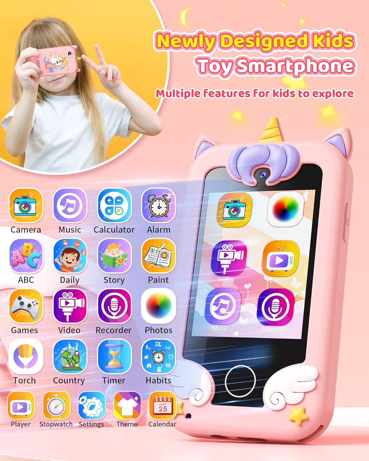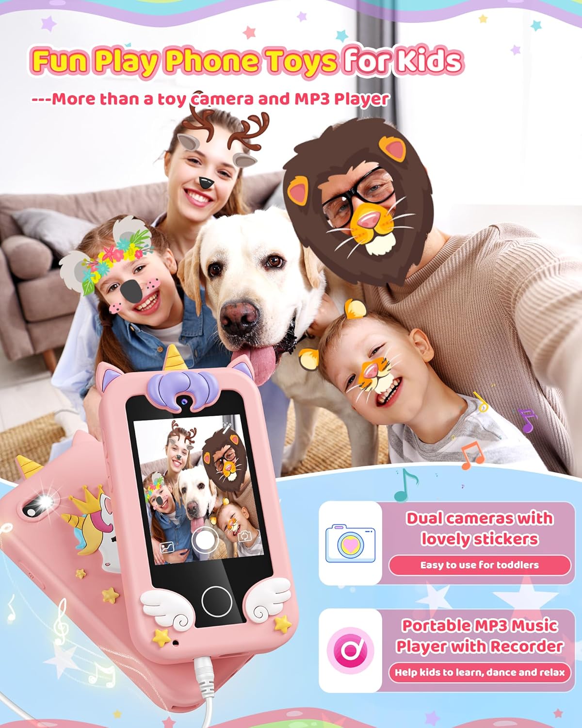 - El teléfono infantil es como un teléfono real, excepto la función de llamada. La pantalla táctil IPS de 2,8 pulgadas permite a los niños elegir fácilmente lo que quieren. Y no necesita comprar una tarjeta SIM para el teléfono de juguete. No tiene que preocuparse por que sus hijos llamen accidentalmente al número equivocado.