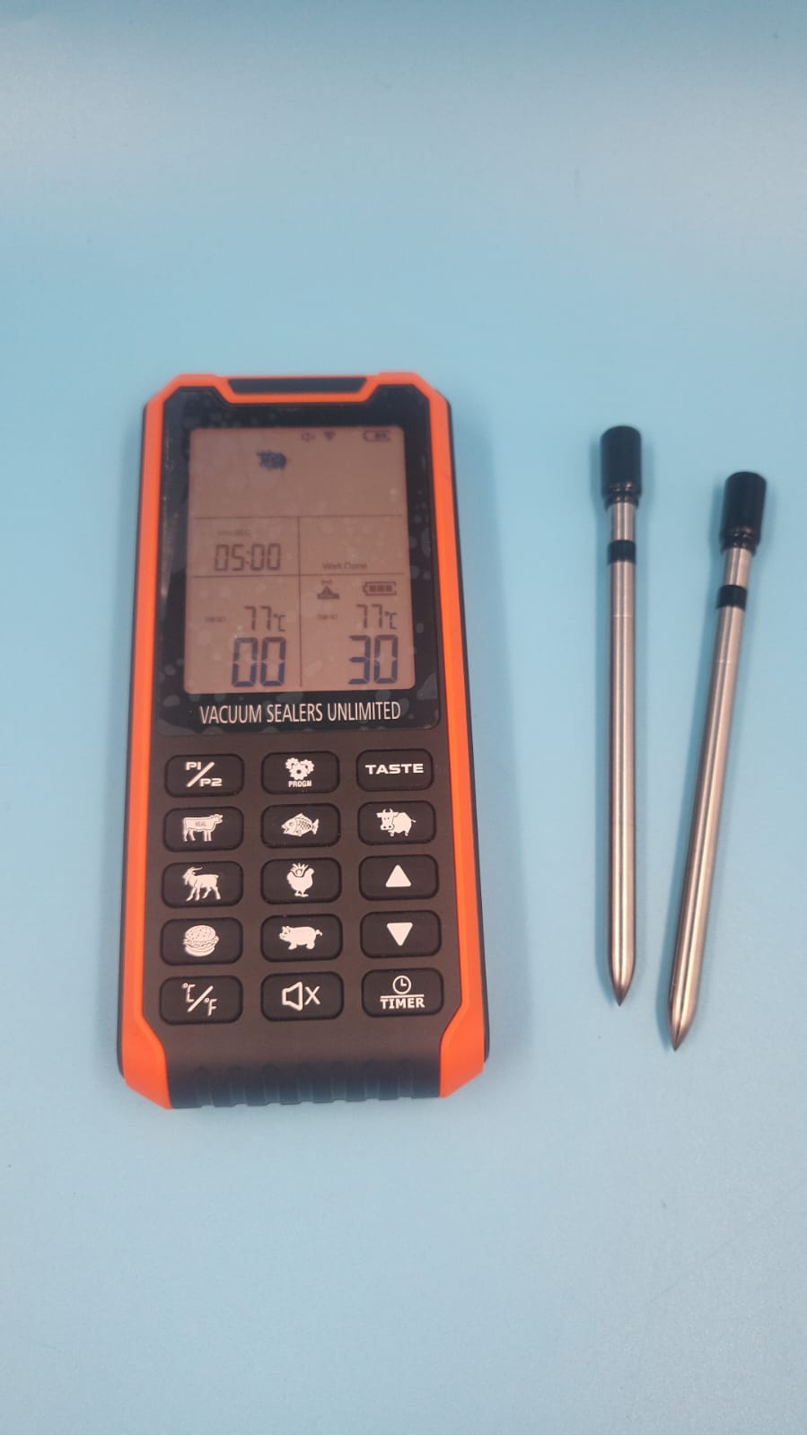 - Sondas dobles de cerámica y conmutación P1/P2 de un solo toque: la sonda de este termómetro inalámbrico para carne está hecha de acero inoxidable y cerámica de grado alimenticio, resistente al calor, no se derrite, impermeable y fácil de limpiar, mide rápidamente temperaturas dentro de los alimentos con un rango de -4 °F a 212 °F. La sonda también cuenta con un mango de cerámica resistente a altas temperaturas y a prueba de golpes diseñado para tolerar temperaturas de 32 °F a 517 °F. Al presionar el botón P1/P2 selecciona la sonda 1 o 2, con el icono de sonda correspondiente parpadeando para una configuración sin esfuerzo. Simplemente conecta la sonda digital del termómetro de carne y comienza a asar con facilidad.