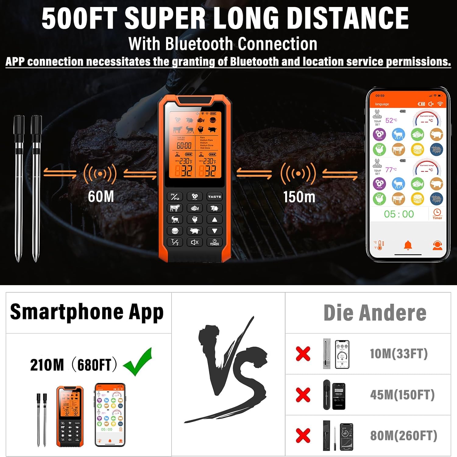 - Funcionamiento inalámbrico de largo alcance de 450 pies: opción dual de host y aplicación: la tecnología Bluetooth 5.2 de este termómetro inalámbrico para parrilla ofrece un control sin cables de hasta 450 pies. La sonda puede trabajar con el host sin la operación de la APP. La distancia desde la sonda hasta el anfitrión debe estar dentro de un rango de 5 pies para equipos de parrilla cerrados y hasta un rango de hasta 60 pies para equipos de parrilla abiertos. Para un alcance remoto más largo, por favor úsalo con la aplicación de teléfono. Descargue la aplicación y conéctela al host, la configuración y la visualización de la aplicación y el dispositivo host se sincronizarán. Coloque el dispositivo anfitrión junto a la cocina, esto le permitirá controlar el proceso de cocción en su teléfono desde una distancia máxima de 450 pies de distancia.