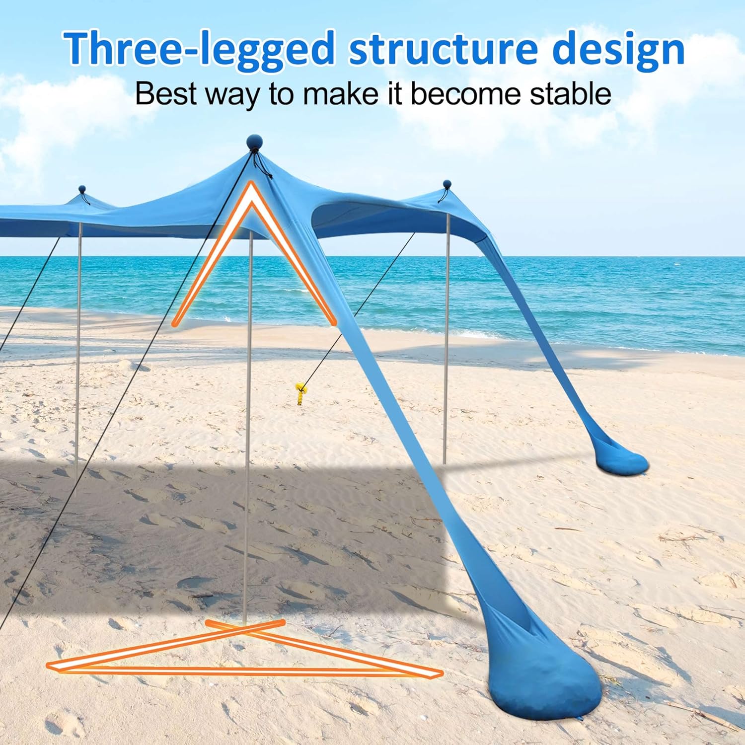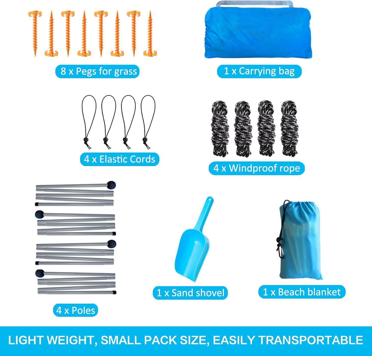 - Más estable: además de la bolsa de anclaje de esquina, añadimos cuerda de viento adicional para que esta tienda de campaña de playa se vuelva más estable, lo que hace que este toldo de playa tenga una mejor resistencia al viento.